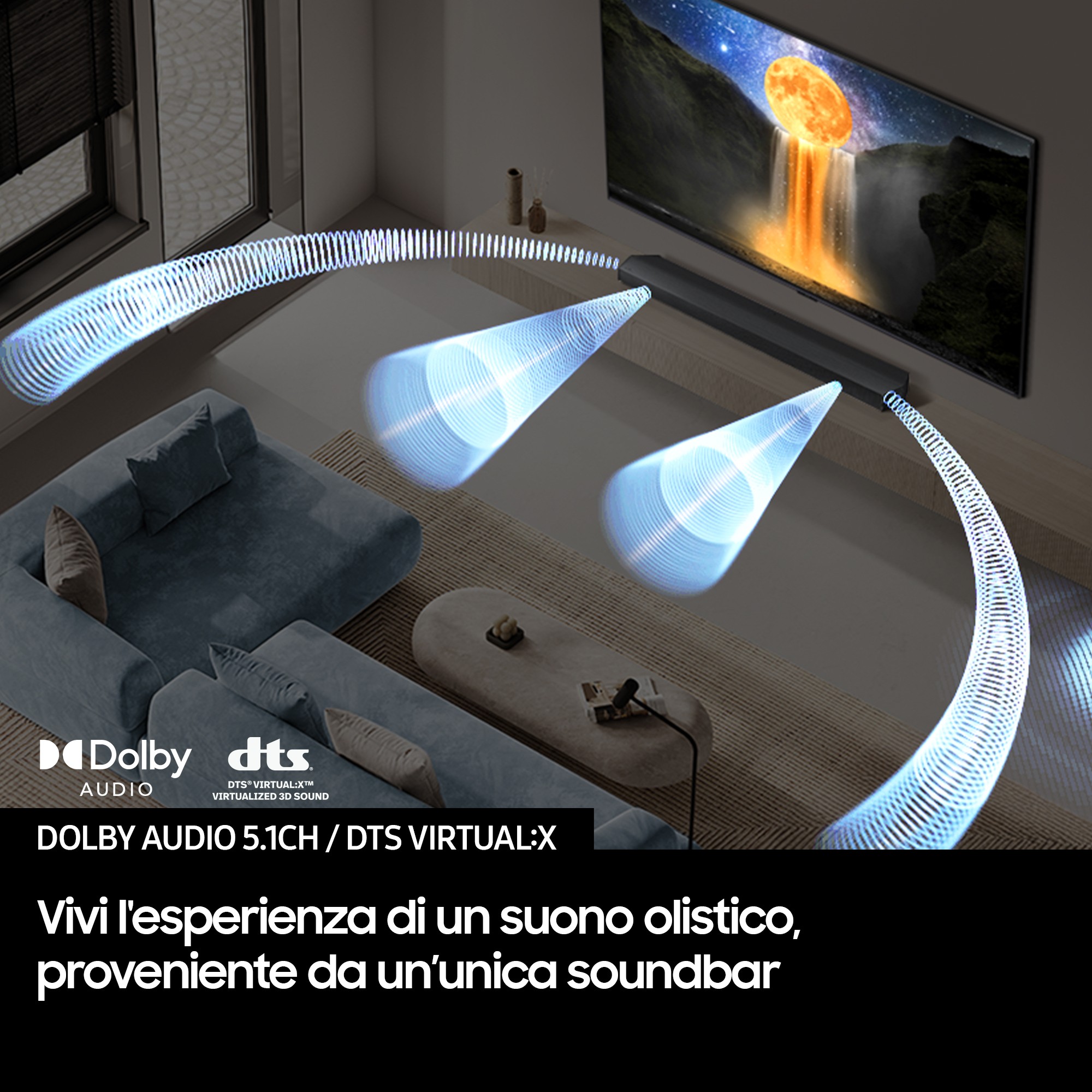 Samsung Soundbar HW-B750F/ZF, Audio 5.1 canali , Wireless Dolby 5.1ch, 2025, 5.1 canali, 400 W, DTS Virtual:X, Dolby Digital 5.1, Nero, AAC, AIFF, FLAC, MP3, OGG, WAV, Wireless