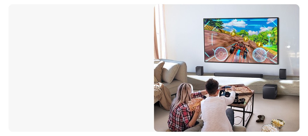 Entra subito nel vivo dell'azione con un audio 3D incredibilmente nitido. La soundbar regola automaticamente l'audio quando rileva una console collegata al televisore Samsung. Inoltre, se utilizzi Gaming Hub sul tuo televisore Samsung, ottimizza l'audio in base al tipo di gioco.
