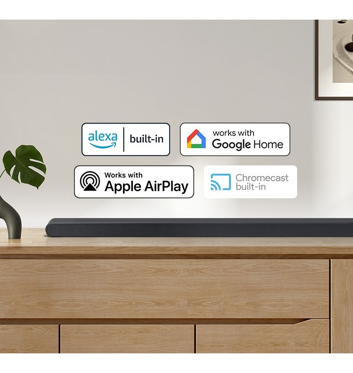 Potrai controllare la soundbar con i comandi vocali utilizzando la funzione Alexa integrata o un dispositivo compatibile con lAssistente Google con Chromecast integrato, oppure utilizzare Chromecast integrato per riprodurre in streaming diversi contenuti audio, compresi i tuoi brani preferiti. In alternativa, puoi anche collegarti ad AirPlay per riprodurre contenuti in streaming: per farlo, ti basterà toccare l'icona AirPlay sul tuo dispositivo Apple. Con Apple AirPlay, puoi ascoltare la tua musica o i tuoi podcast preferiti direttamente dalliPhone o dalliPad.