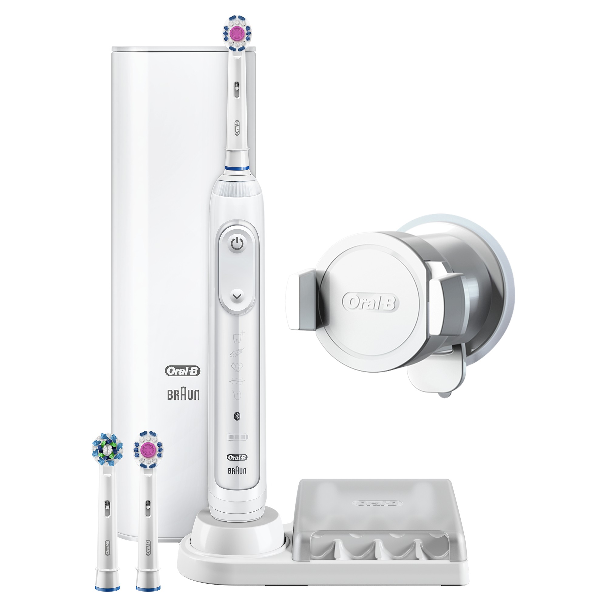 Oral-B 8200W 3DWhite, Genius. Alimentazione: Batteria, Durata batteria: 288 h, Tecnologia batteria: Ioni di Litio. Peso: 630 g, Larghezza imballo: 99 mm, Profondità imballo: 235 mm. Numero di manici inclusi: 1 pezzo(i), Numero di testine incluse: 3 pezzo(i)
