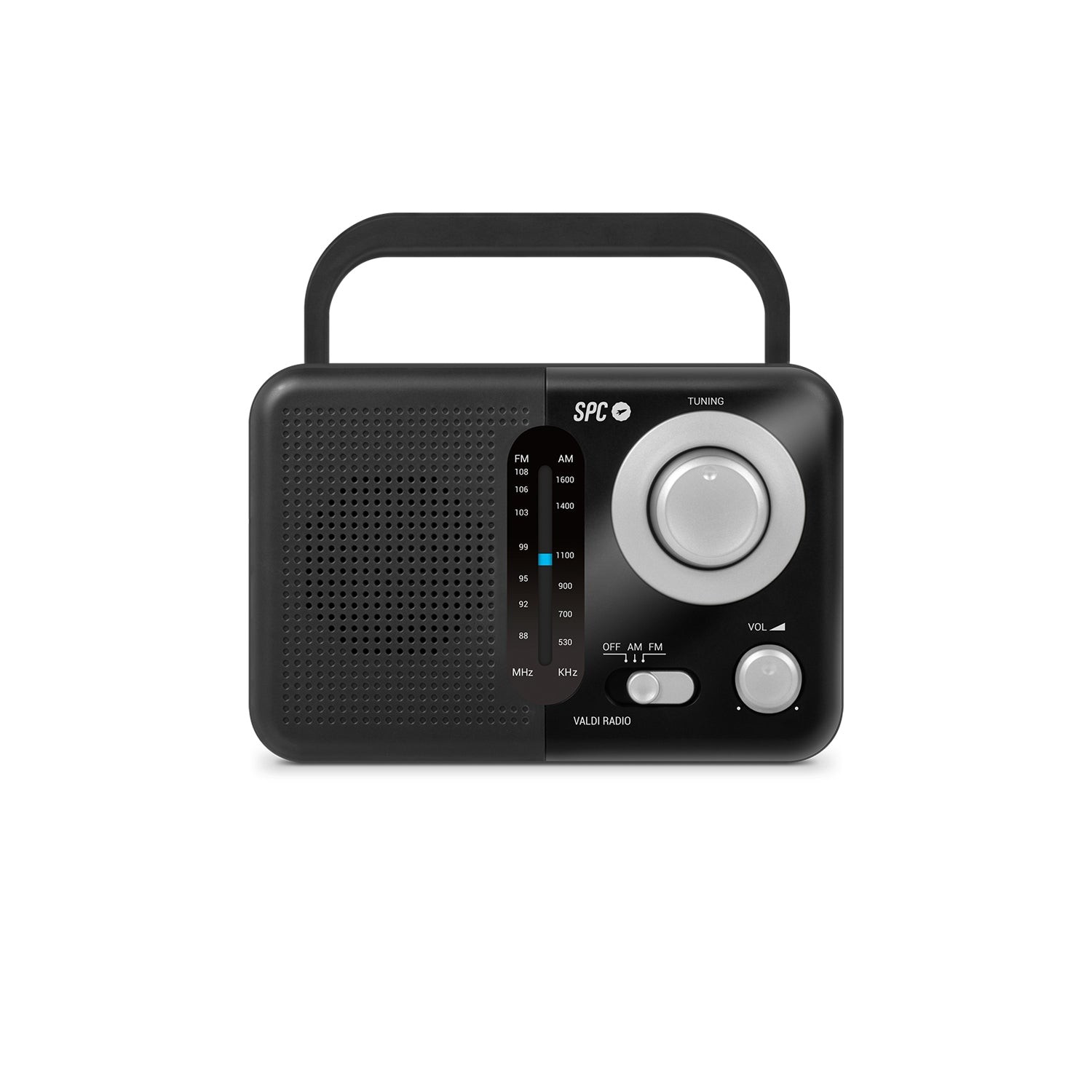 SPC Valdi. Tipo radio: Personale, Tipo sintonizzatore: Analogico, Bande del sintonizzatore: AM, FM. Potenza in uscita (RMS): 0,8 W. Impedenza: 8 Ω. Colore del prodotto: Nero, Colorazione: Monocromatico, Controllo del volume: Manopola. Dimensioni della batteria compatibile: LR14, Voltaggio della batteria: 1,5 V