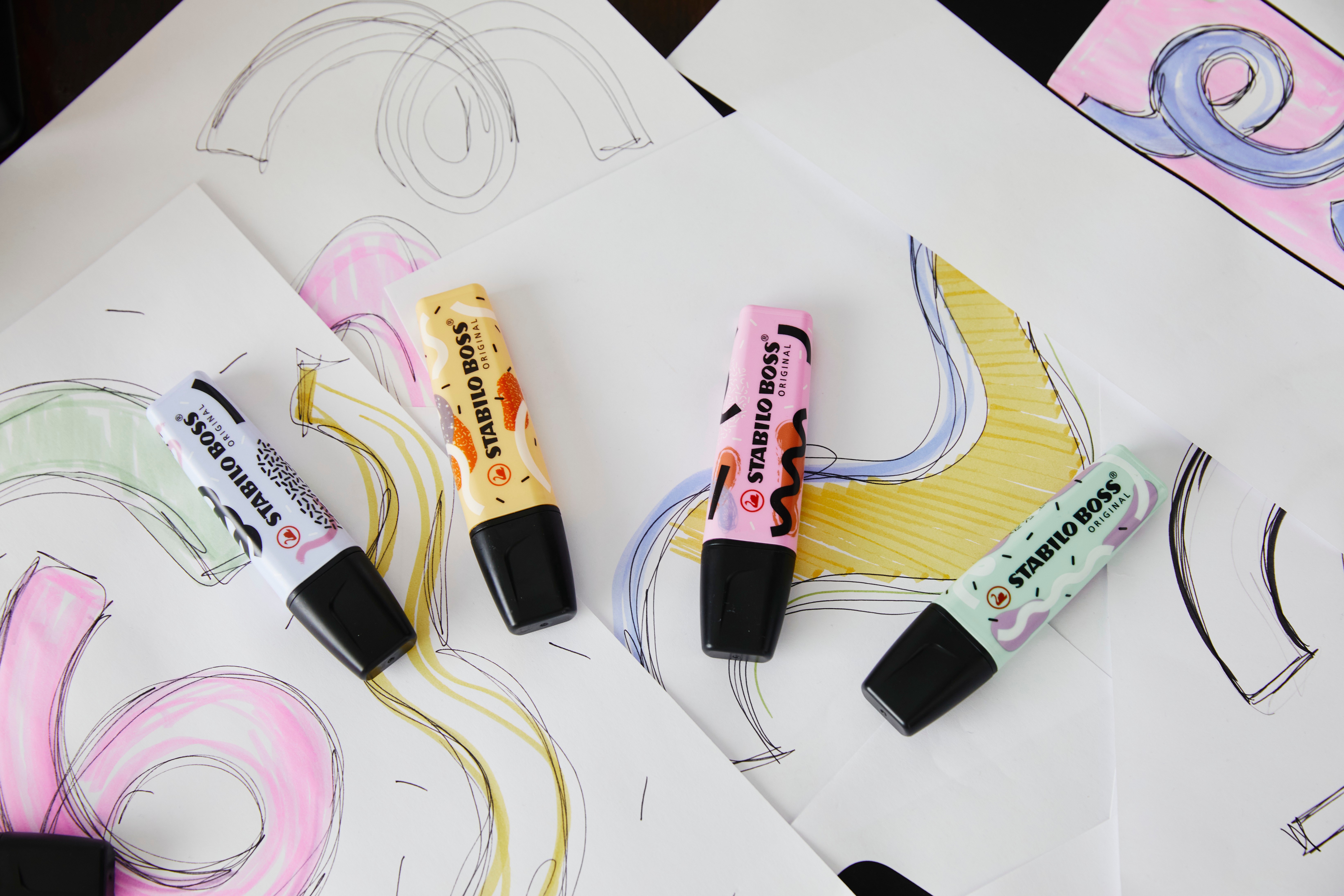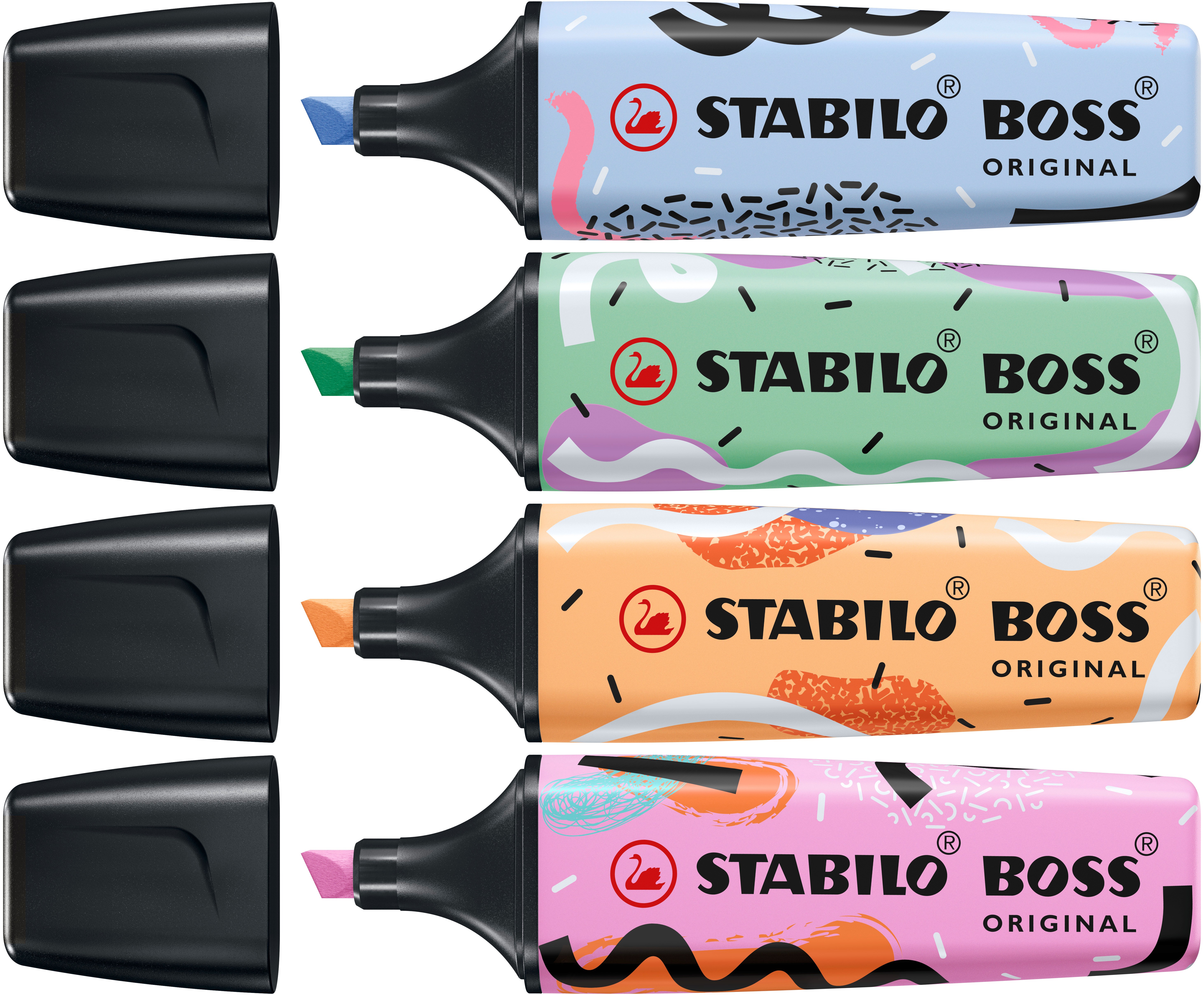STABILO BOSS ORIGINAL. Quantità per pacco: 4 pz, Colore penna: Blu, Fucsia, Menta, Arancione, Tipo di tappo: Punta smussata. Larghezza imballo: 18 mm, Profondità imballo: 110 mm, Altezza imballo: 136 mm