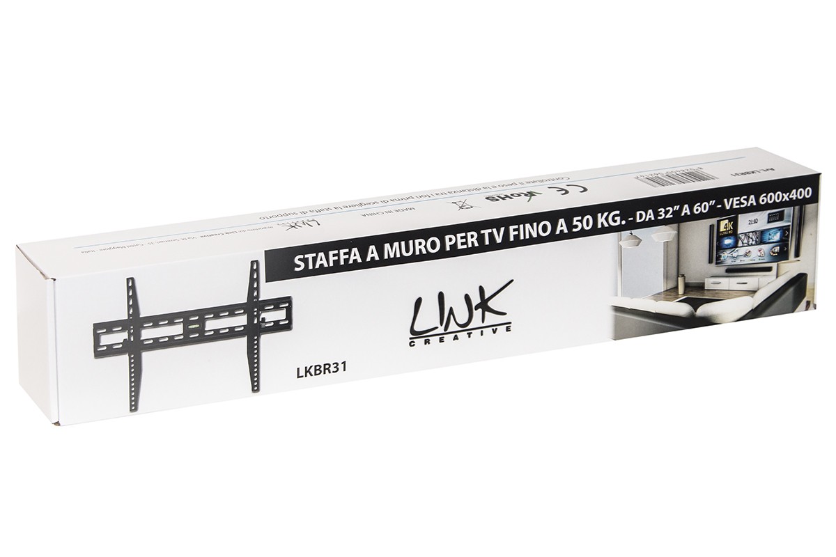 Link Accessori LKBR31. Peso massimo (capacità): 50 kg, Capienza minima dimensioni dello schermo: 81,3 cm (32"), Capienza massima dimensioni dello schermo: 152,4 cm (60"), Compatibilità interfaccia di montaggio (min): 75 x 75 mm, Compatibilità interfaccia di montaggio (max): 600 x 400 mm. Inclinazione: -10 - 10°, Distanza dal muro (massima): 4,3 cm. Colore del prodotto: Nero