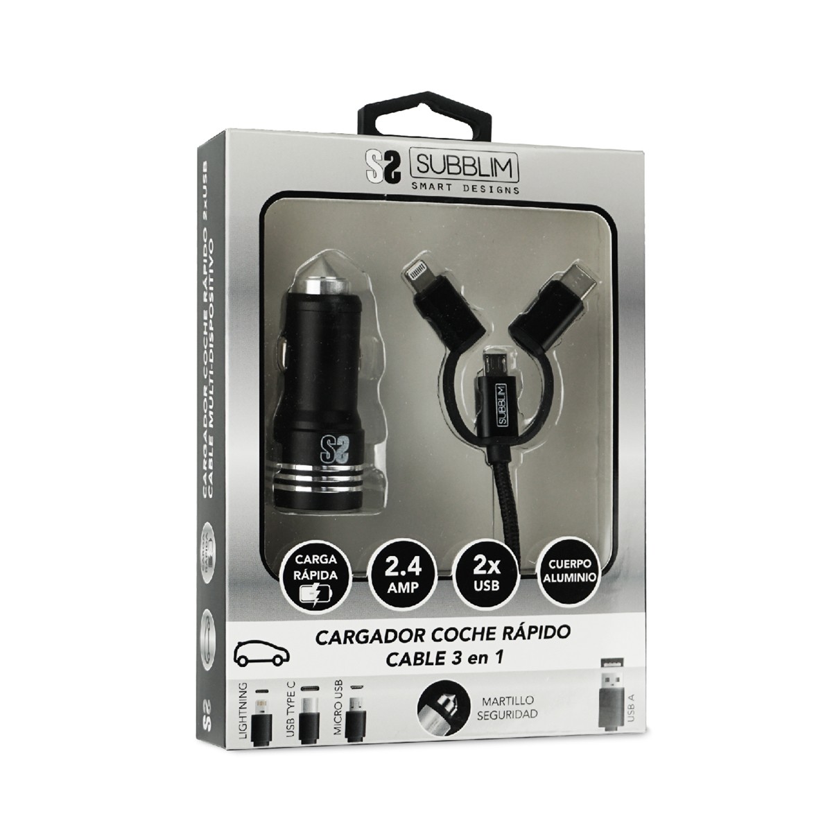 SUBBLIM SUB-CHG-4CC002. Tipo di caricatore: Auto, Tipologia alimentazione: Accendisigari, Compatibilità caricatore: Universale. Voltaggio di ingresso: 12-24 V, Tensione di uscita (max): 5 V. Quantità porte USB 2.0: 2, Ricarica rapida, Funzionalità di protezione dell'alimentazione: Sovracorrente, Sovralimentazione, Sovraccarico, Sovraccarico, Sovraccarico. Lunghezza cavo: 1 m, Colore del prodotto: Nero