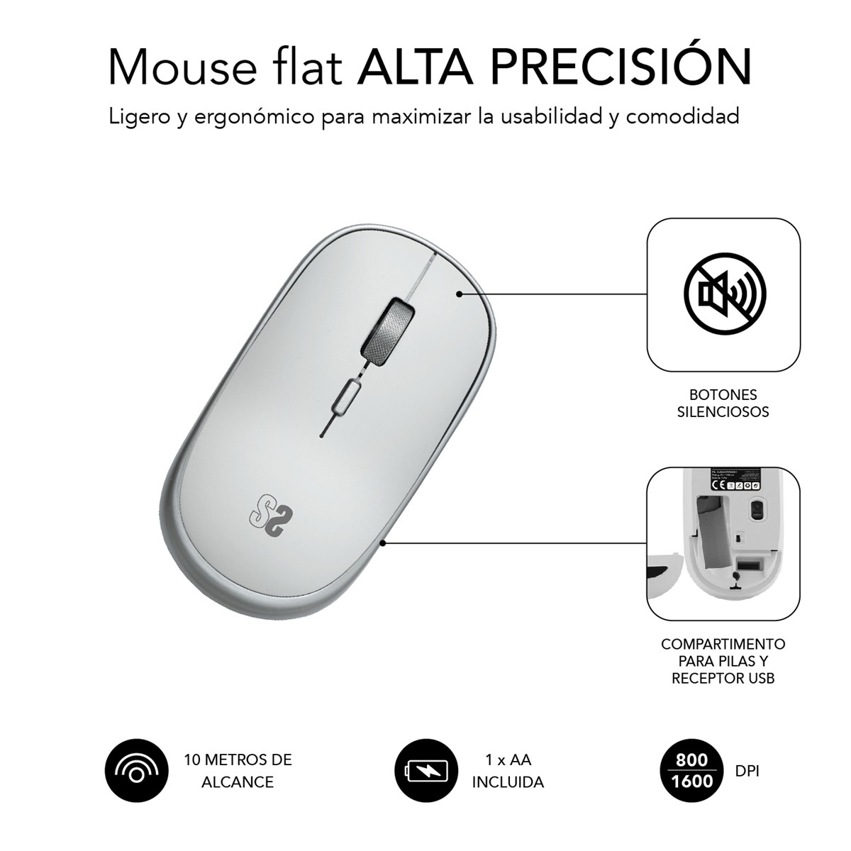 SUBBLIM SUBMO-RFM0001, Ambidestro, Ottico, RF Wireless, 1600 DPI, Argento, Bianco