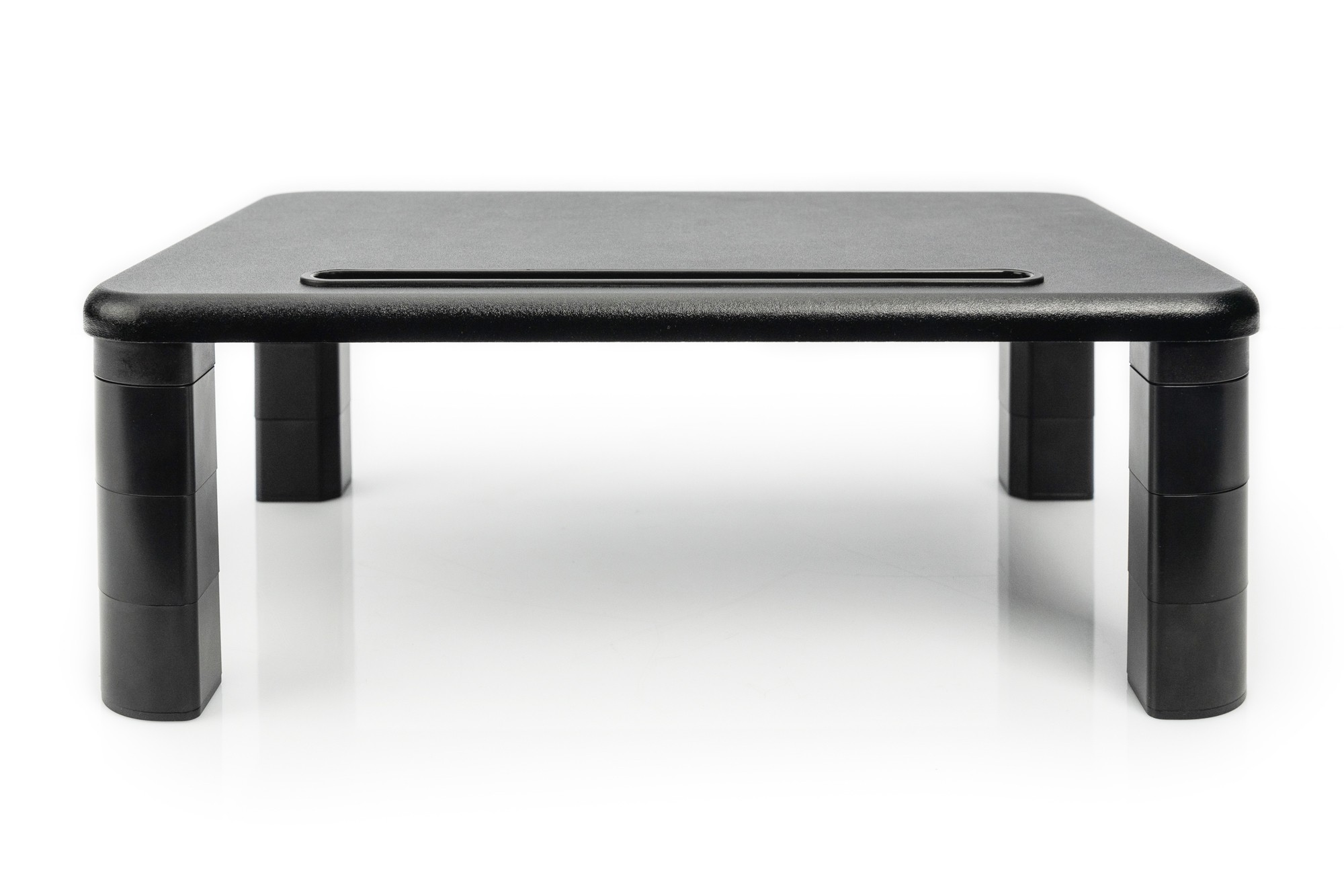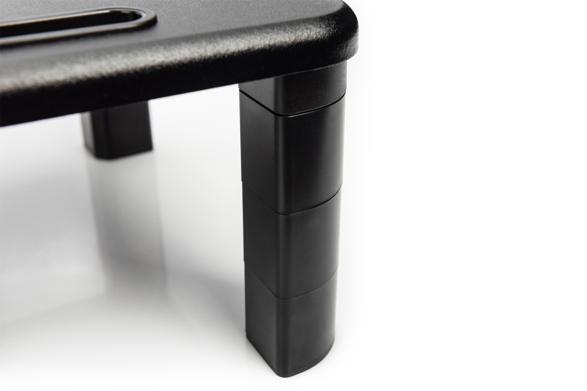 The height-adjustable monitor riser enables you to individually organize your workplace. Through the modular design of the feet, you can flexibly increase the height in three steps and put your tablet or smartphone in the front area. - Easy-to-operate height-adjustable monitor riser - Triple height-adjustable up to 14.5 cm - Tablet and smartphone holder in the front area with cable routing - You have your tablet or smartphone in view at all times - Maximum load: 10 kg - The area underneath the riser attachment can be used, for example, for a desktop PC, etc. With the ergonomic monitor riser, you have an easy-to-use product with which you can individually organize your desk. The modular design of the foot allows you to easily change the height of the holder by adding or removing support elements. In addition, there is a smartphone and tablet holder in the front area with openings for charging or connection cables.