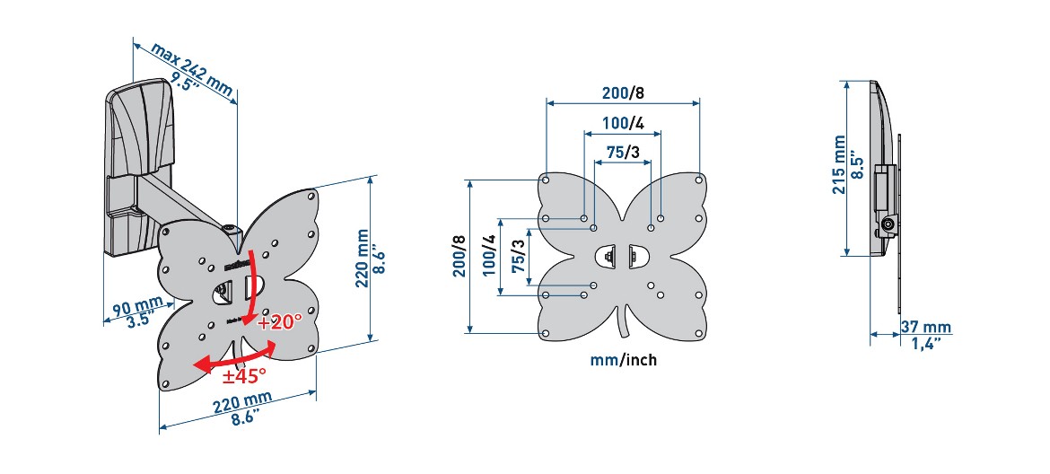 Meliconi Slimstyle Plus 200SR, 200 x 100 mm, 200 x 200 mm, -20 - 20°, -45 - 45°, Metallo, Nero