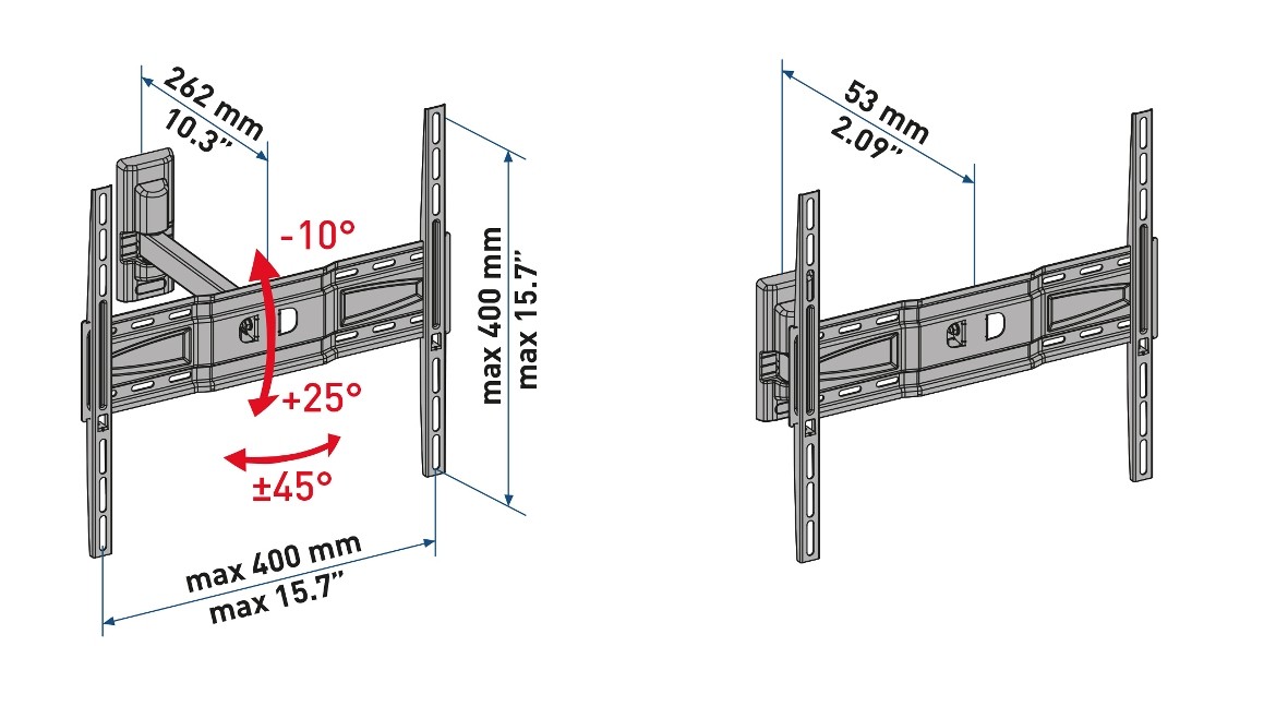 Meliconi CME ER400. Peso massimo (capacità): 25 kg, Capienza minima dimensioni dello schermo: 101,6 cm (40"), Capienza massima dimensioni dello schermo: 139,7 cm (55"), Compatibilità interfaccia di montaggio (min): 200 x 200 mm, Compatibilità interfaccia di montaggio (max): 400 x 400 mm. Inclinazione: -5 - 10°, Angolo di rotazione: -45 - 45°. Colore del prodotto: Nero
