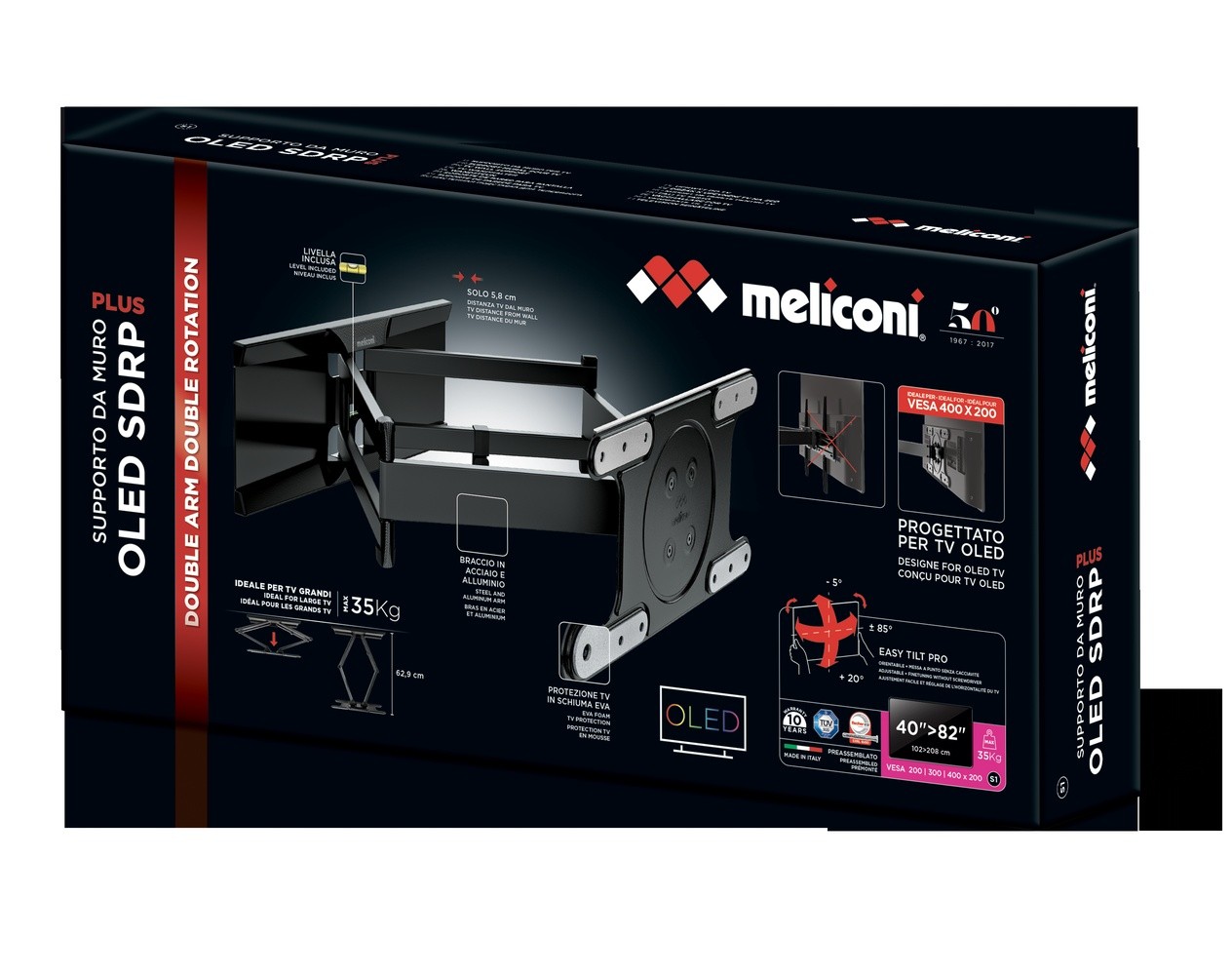 Meliconi OLED SDRP. Peso massimo (capacità): 35 kg, Capienza minima dimensioni dello schermo: 101,6 cm (40"), Capienza massima dimensioni dello schermo: 2,08 m (82"), Compatibilità interfaccia di montaggio (min): 200 x 200 mm, Compatibilità interfaccia di montaggio (max): 400 x 200 mm. Inclinazione: -5 - 20°, Angolo di rotazione: 170°, Distanza dalla parete (min): 5,8 cm, Distanza dal muro (massima): 62,9 cm. Colore del prodotto: Nero