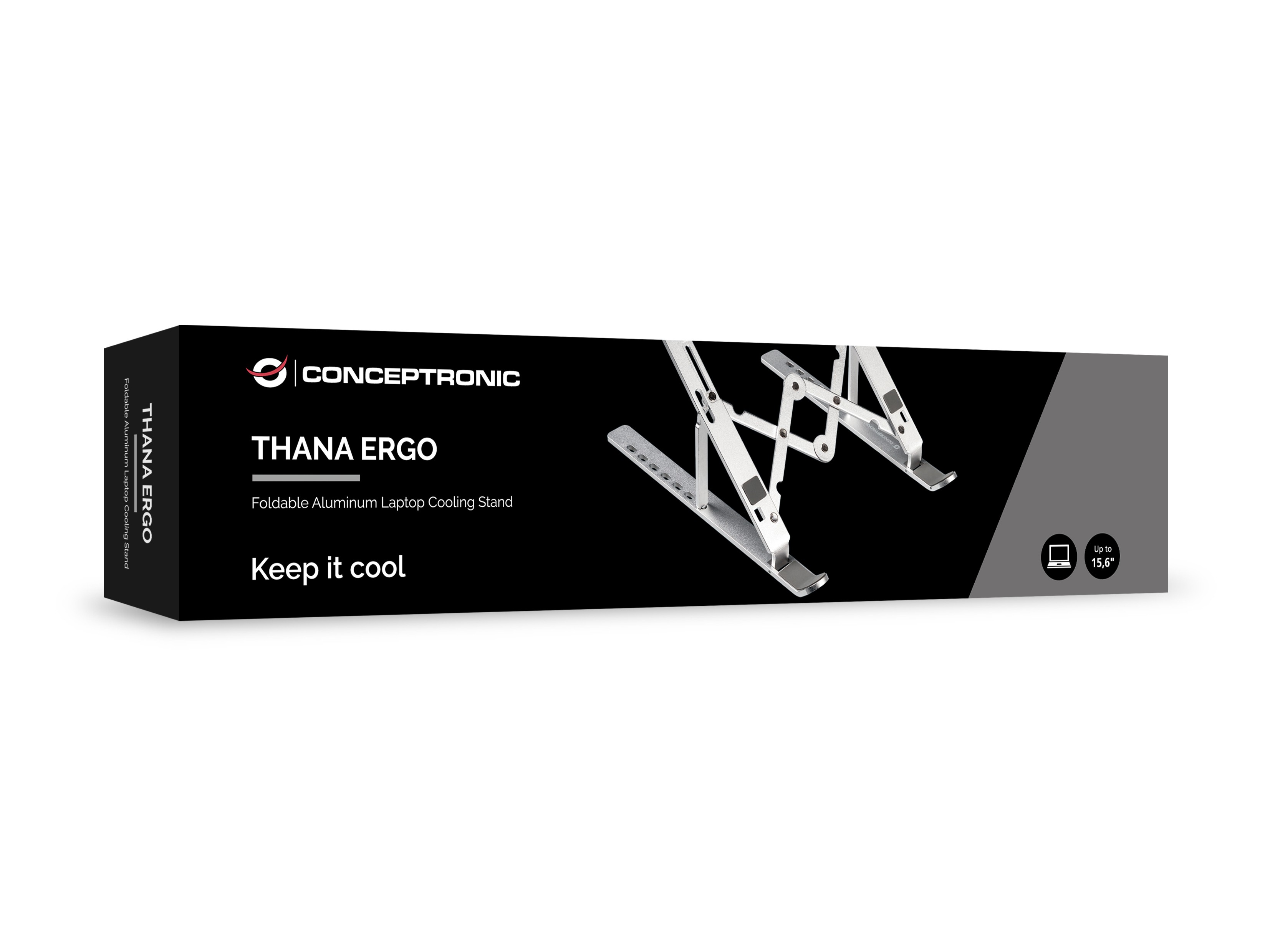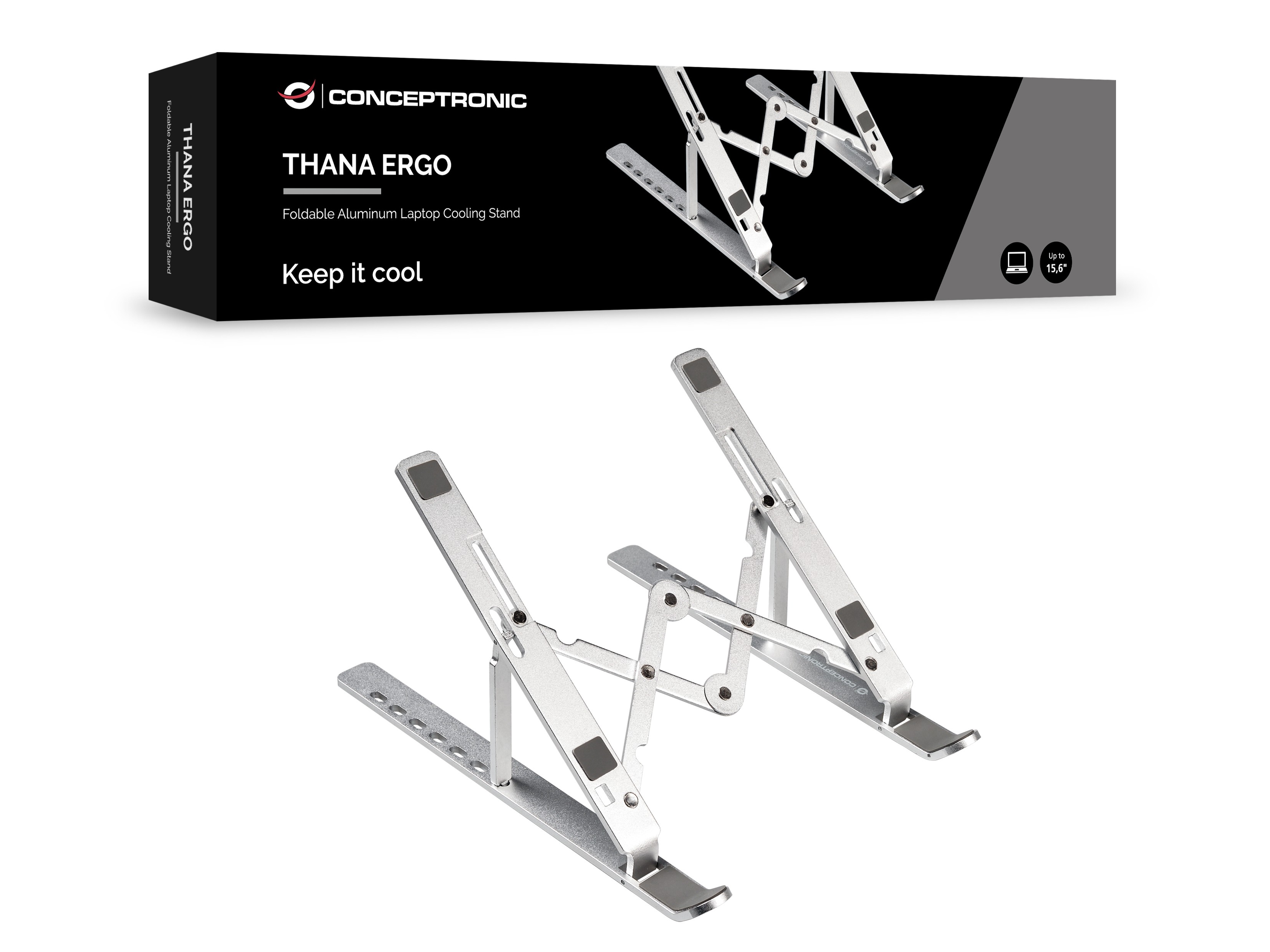Conceptronic THANA04S. Tipo di prodotto: Supporto per computer portatile, Colore del prodotto: Argento, Materiali: Alluminio. Larghezza: 255 mm, Profondità: 45 mm, Altezza: 18 mm. Larghezza imballo: 270 mm, Profondità imballo: 55 mm, Altezza imballo: 28 mm. Larghezza scatola principale: 29 mm, Lunghezza del cartone principale: 28 mm, Altezza scatola principale: 24 mm