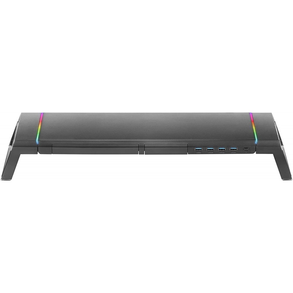 Supporto per monitor premium con illuminazione CHROMA RGB avanzata, HUB anteriore USB 3.0 a 4 porte, supporto per cellulare/tablet e cassetto portaoggetti. Completamente regolabile in 3 misure grazie ai lati pieghevoli.