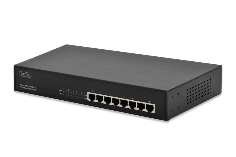 Digitus DN-95321. Tipo di porte RJ-45: Fast Ethernet (10/100), Quantità di porte RJ-45: 8. Full duplex, Standard di rete: IEEE 802.3af,IEEE 802.3x. Connettore di alimentazione: Jack di ingresso AC. Supporto Power over Ethernet (PoE). Montaggio rack, Fattore di forma: 1U