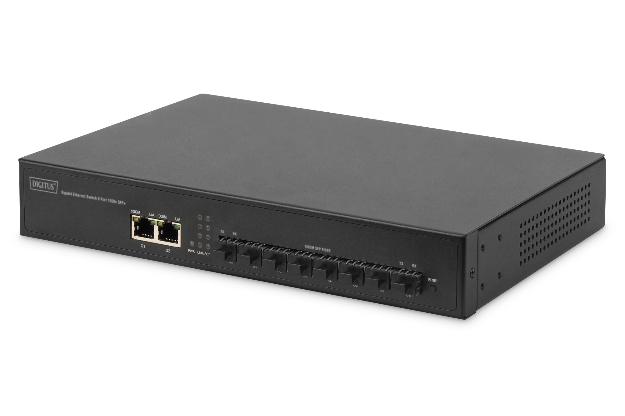 Digitus Switch in fibra ottica Gigabit, 8 porte SFP, 2 porte uplink RJ45, Non gestito, Gigabit Ethernet (10/100/1000), Montaggio rack, 1U, Montabile a parete