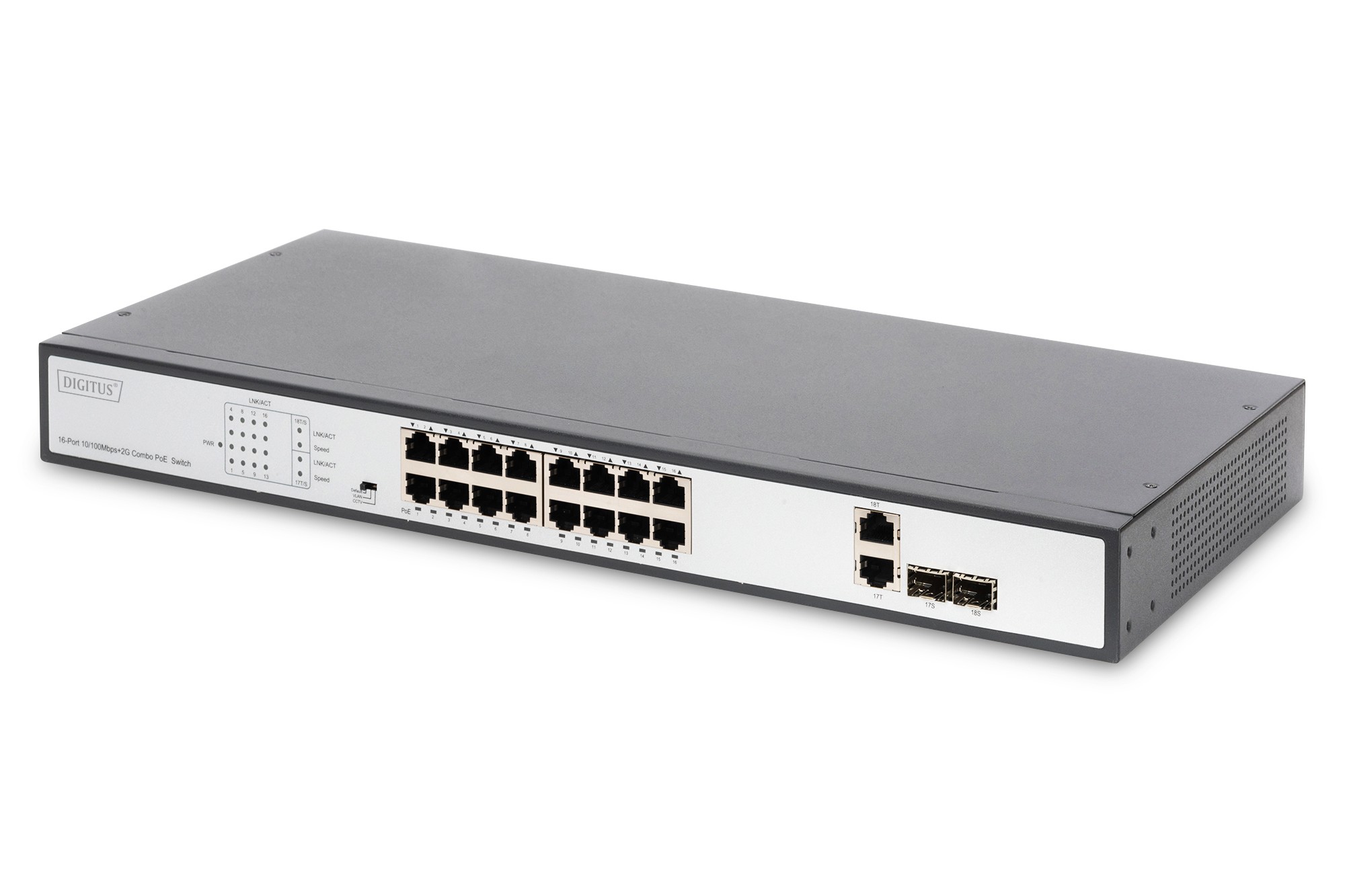 Digitus Switch Fast Ethernet PoE a 16 porte, Non gestito, Fast Ethernet (10/100), Supporto Power over Ethernet (PoE), Montaggio rack, 1U
