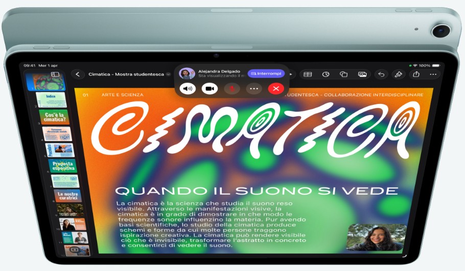 - PERCHÉ IPAD AIR – iPad Air con chip Apple M4 ti offre prestazioni ancora più scattanti e uno splendido design in due taglie superportatili. Ha le potenti funzioni di Apple Intelligence, uno spettacolare display Liquid Retina, Touch ID, fotocamere evolute e Wi Fi 7.