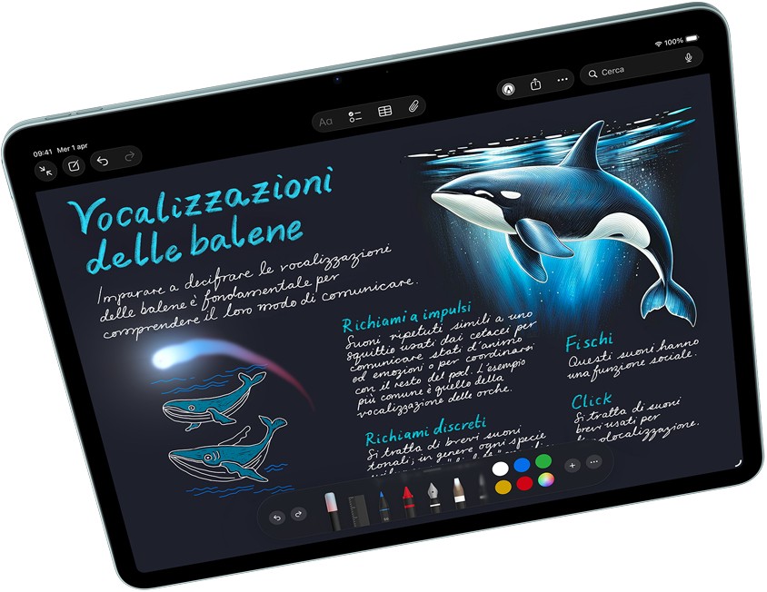 Disegna, dipingi, prendi appunti: Apple Pencil rende tutto più facile e intuitivo, come per magia. È precisa al pixel, ha una bassa latenza, cambia il tratto in base all’inclinazione. Mentre la usi puoi appoggiare la mano sullo schermo, proprio come faresti su un foglio. E Apple Pencil Pro ha una serie di funzioni ancora più evolute per aiutarti a dare vita alle tue idee.