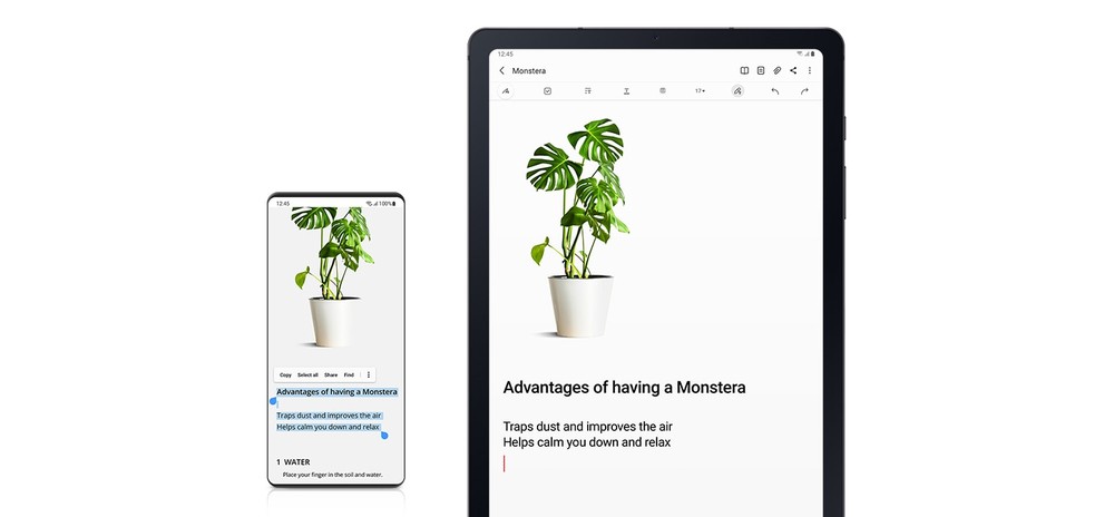 Lavora alla perfezione su più dispositivi. Puoi copiare del testo o un'immagine dal tuo smartphone e incollarlo sul tuo tablet, e viceversa. Oppure scrivere degli appunti personali con Samsung Notes o navigare su Samsung Internet dal tuo tablet e, successivamente, aprire le stesse app sul tuo smartphone per ripartire da dove avevi interrotto.
