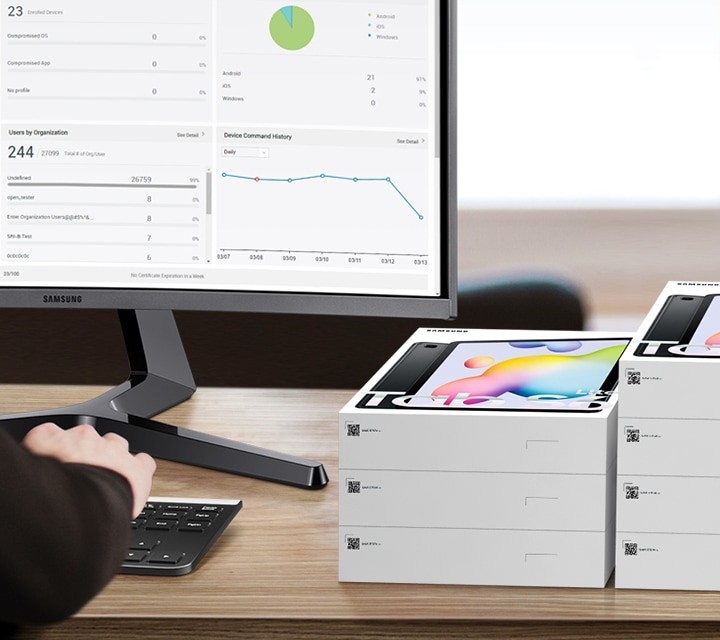 Gestisci facilmente una flotta di Galaxy Tab S6 Lite con una soluzione EMM basata sul cloud che aumenta l'efficienza della tua attività. Knox Manage consente all'amministratore IT di gestire, tramite controllo remoto, eventuali problemi in tempo reale, prevenendo al contempo la fuga di dati aziendali riservati grazie alla limitazione di azioni involontarie.