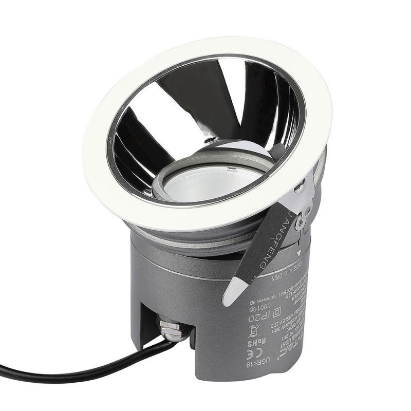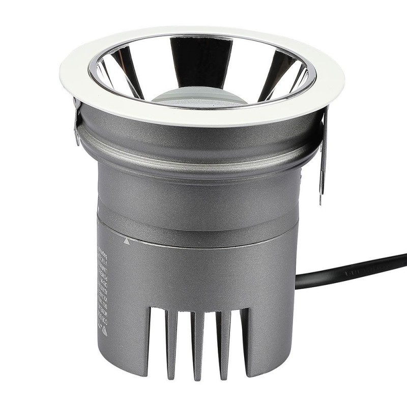 Faretto LED da incasso potenza VT-2936 con potenza di 35W Forma Rotonda in alluminio di colore grigio con cover bianca e testina orientabile di 27° dotata di alette autobloccanti per il fissaggio LED COB CREE con fascio luminoso di 27° regolabile, flusso luminoso di 2300 lm e un rapporto di 65lm/W Lampadina con indice di resa cromatica (CRI) >95 Il CRI indica la fedeltà nel riprodurre le diverse gamme cromatiche di una fonte luminosa, più si avvicina al valore 100, più i colori sono brillanti, naturali e fedeli alla realtà Elegante e adatto all'incasso nei controsoffitti in cartongesso o legno, può essere sostituito in uffici, showroom e sale conferenze