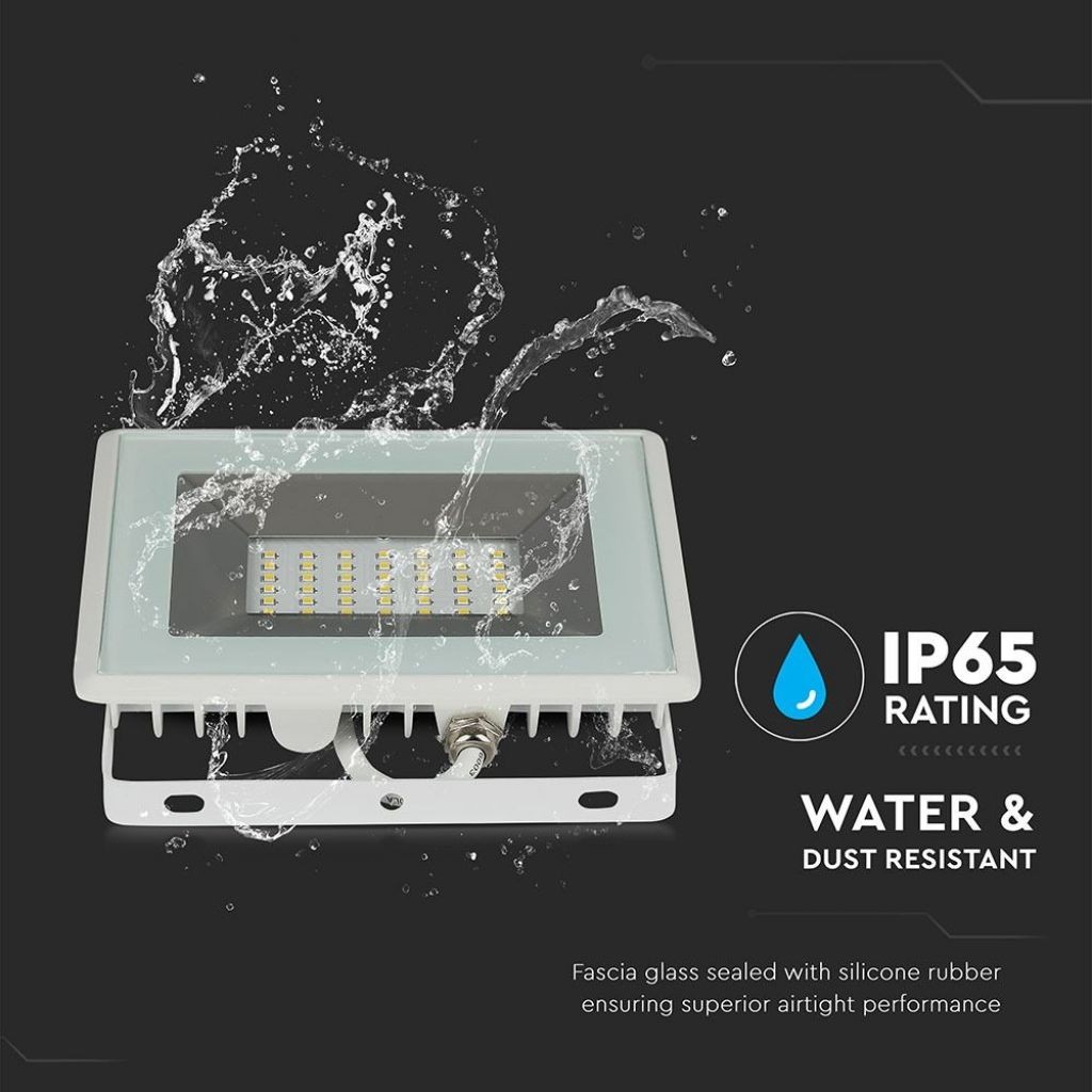 Faro LED V-TAC VT-4031 E-Series dotato di una potenza di 30W. Corpo ultra sottile in alluminio pressofuso di colore bianco e cavo di colore bianco con copertura in vetro trasparente. Proiettore con tecnologia LED SMD. Adatto all'uso esterno con grado di protezione IP65. fascio luminoso di 110° e flusso luminoso di 2550 lm. Questo faretto, ha un rapporto di 85 lm/W. La potenza di 30W è equivalente a 150W di un faro alogeno. Il design slim, lo rende più leggero di un normale faro e più semplice da installare, oltre ad avere un'estetica più accattivante.