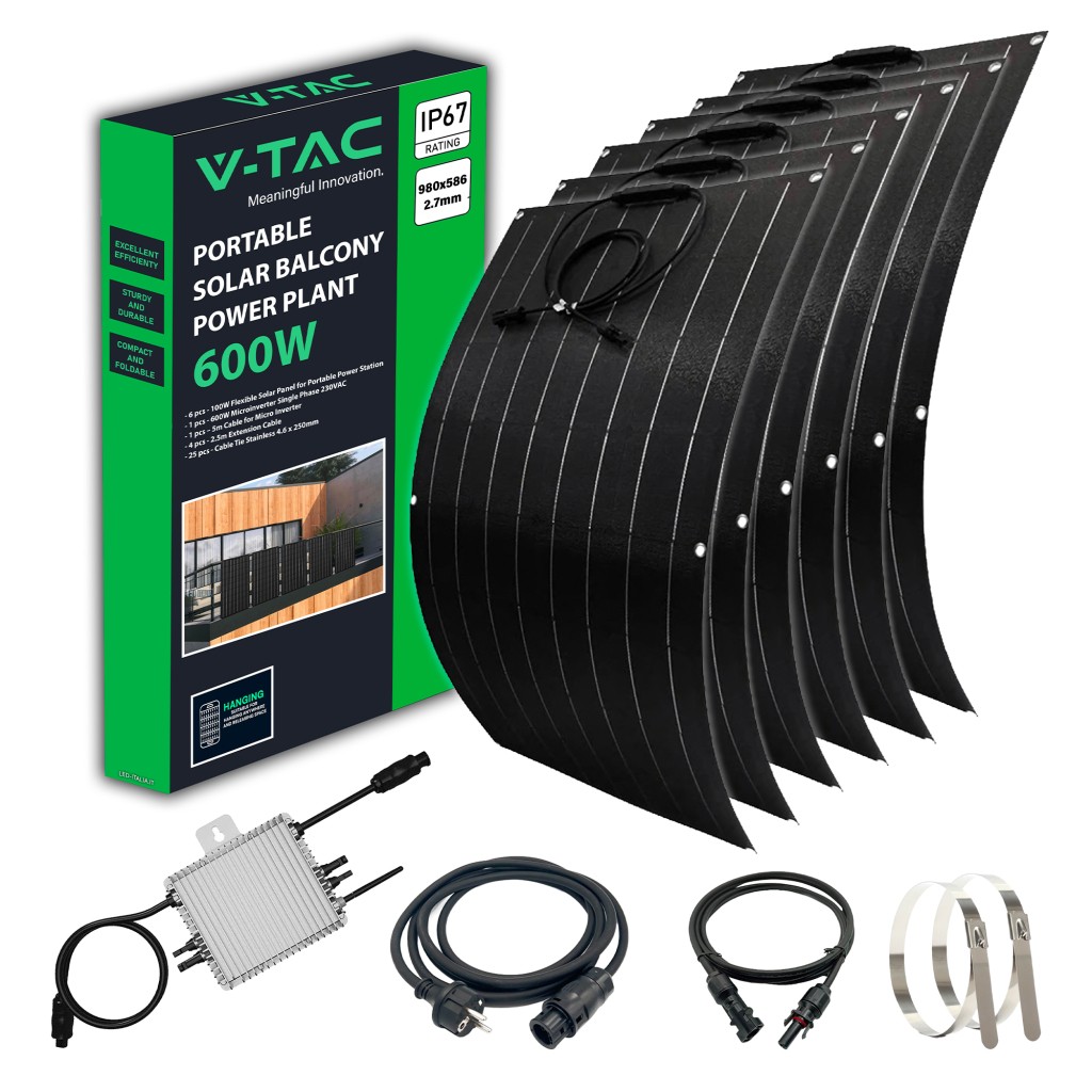 Recensioni V-TAC KIT Fotovoltaico da Balcone 600W Plug and Play con 6 Pannelli Fotovoltaici 100W Flessibili, 4 Prolunghe di Cavo Solare 2,5m, Microinverter 600W, Cavo AC 5m e Fascette di Fissaggio