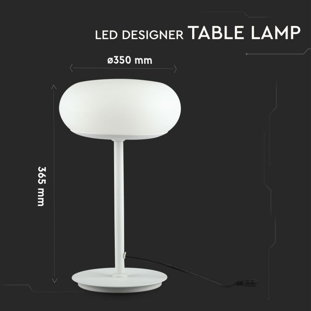 VT-7353 lampada LED da tavolo con potenza di 25W dimmerabile con comando touch Lampada realizzata in metallo e copertura in materiale plastico opaco con effetto finale di una piacevole illuminazione soffusa La base è di colore bianco e può essere appoggiata su qualsiasi superficie delicata, grazie al rivestimento in gomma nella parte inferiore La lampada ha una potenza di 25W, fascio luminoso di 120° e luminosità di 2550lm Attraverso il tocco del pulsante, è possibile accendere o spegnere la lampada e regolare in sequenza 3 diversi livelli d'intensità luminosa Grado di protezione IP20 e alimentatore incluso Adatto ad un uso interno, ideale per creare un arredo elegante e di stile