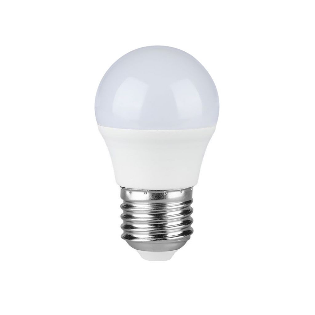 Lampadina LED V-TAC VT-1879 dotata di una potenza di 5,5W e attacco E27. Forma miniglobo G45 in materiale plastico bianco con copertura opaca. Tecnologia LED SMD caratterizzata da un fascio luminoso di 180°, flusso luminoso di 470 lm e rapporto di 85 lm/W. La potenza di 5,5W è equivalente a 40W di una Lampadina a incandescenza.