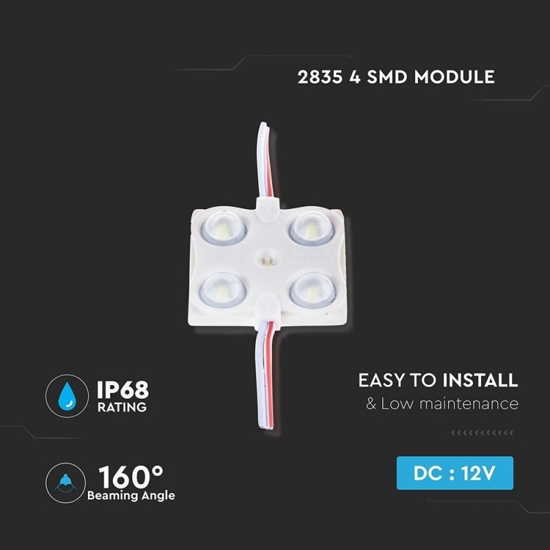 Modulo LED potenza VT-28356 monocolore composto da 4 LED SMD 2835 con potenza totale di 1,44W e flusso luminoso di 120 lm Il modulo è ideale per l'installazione all'interno di scatolari ad illuminazione diretta e non, ed è utilizzable anche nell'illuminazione architettonica di interni ed esterni grazie al grado di protezione IP65 e il corpo in PVC. Date le ridotte dimensioni, è possibile creare insegne pubblicitarie o di segnalazione con qualsiasi misura e spessore Il fascio luminoso di 160° consente una distribuzione omogenea della luce, mentre il biadesivo applicato sul retro rende il modulo di facile installazione Il collegamento tra i moduli effettuato con cavi, permette di alimentarli da un unico punto Questo modulo permette infiniti tipi di utilizzo sia in ambito domestico che industriale