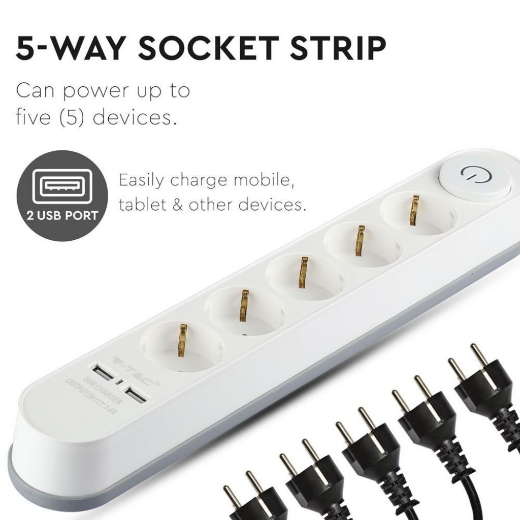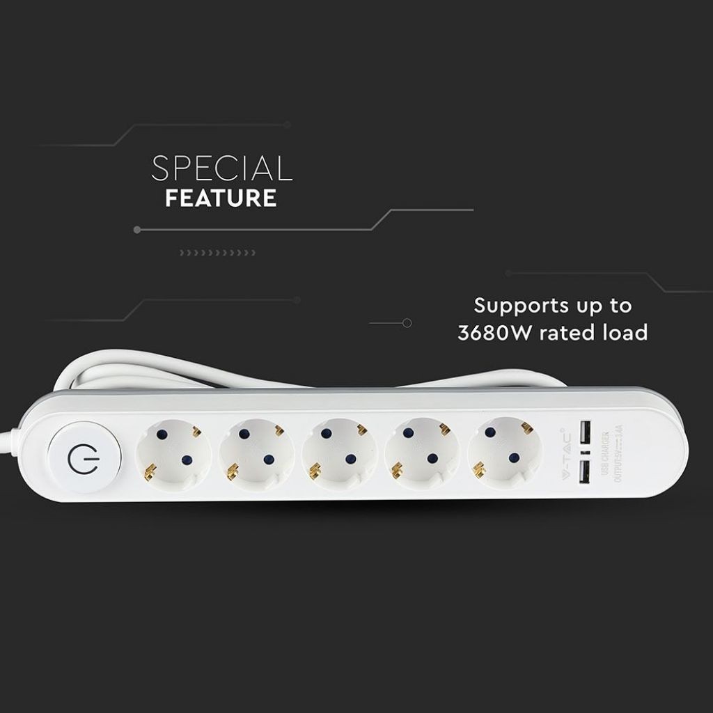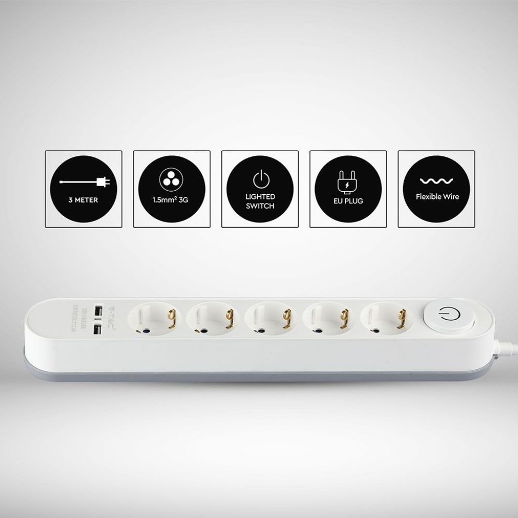 Recensioni V-TAC Multipresa con Cavo 3m 5 Prese 16A con Interruttore Luminoso e 2 USB Colore Bianco