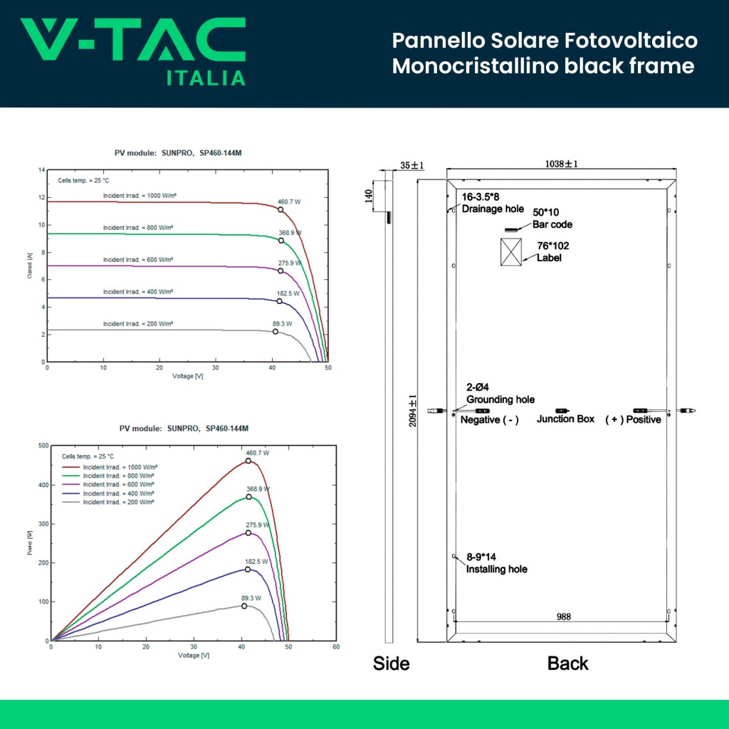 V-TAC SKU 11896 è un modulo fotovoltaico monocristallino di potenza 460W e dimensioni 2094x1038x35mm. La potenza nominale per superficie è pari a 210W/m²