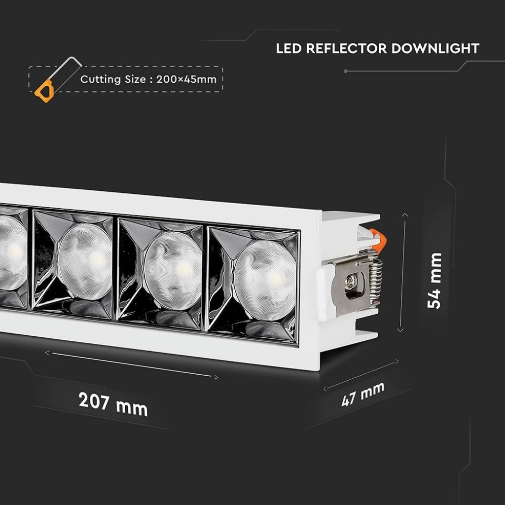 Faretto LED da incasso potenza VT-2-21 con potenza di 20W Forma Rettangolare in Alluminio di colore bianco Racchiude 5 riflettori LED SMD con fascio luminoso di 38°, flusso luminoso di 1600 lm totali e rapporto di 80 lm/W