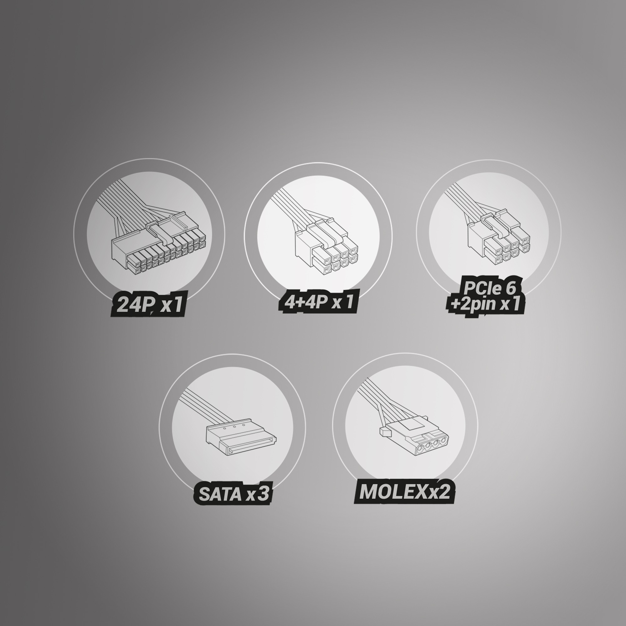6 anni di garanzia grazie alla più recente tecnologia di produzione SMD ad alta precisione e alla tecnologia di conversione DC-DC, al PCB in fibra di vetro a doppio strato e ai componenti di grado A per un'affidabilità totale. Massima silenziosità con la nuova tecnologia AI-RPM e ventola XL da 140 mm. Efficienza APFC DIGITAL del 99%, efficienza elettrica dell'87%, cavi piatti neri extra lunghi e 10 sistemi di protezione e sicurezza inclusi.