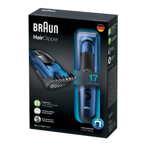 Braun HC5030, Tagliacapelli, Regolabarba Uomo, Rasoio Elettrico Barba Con 17 Impostazioni Di Lunghezza. Colore del prodotto: Nero, Blu, Lunghezza minima del taglio: 3,5 cm, Lunghezza massima del taglio: 3 mm. Alimentazione: CA/Batteria, Tempo di funzionamento: 50 min, Tipo batteria: Da Incasso. Larghezza imballo: 570 mm, Profondità imballo: 155 mm, Altezza imballo: 222 mm