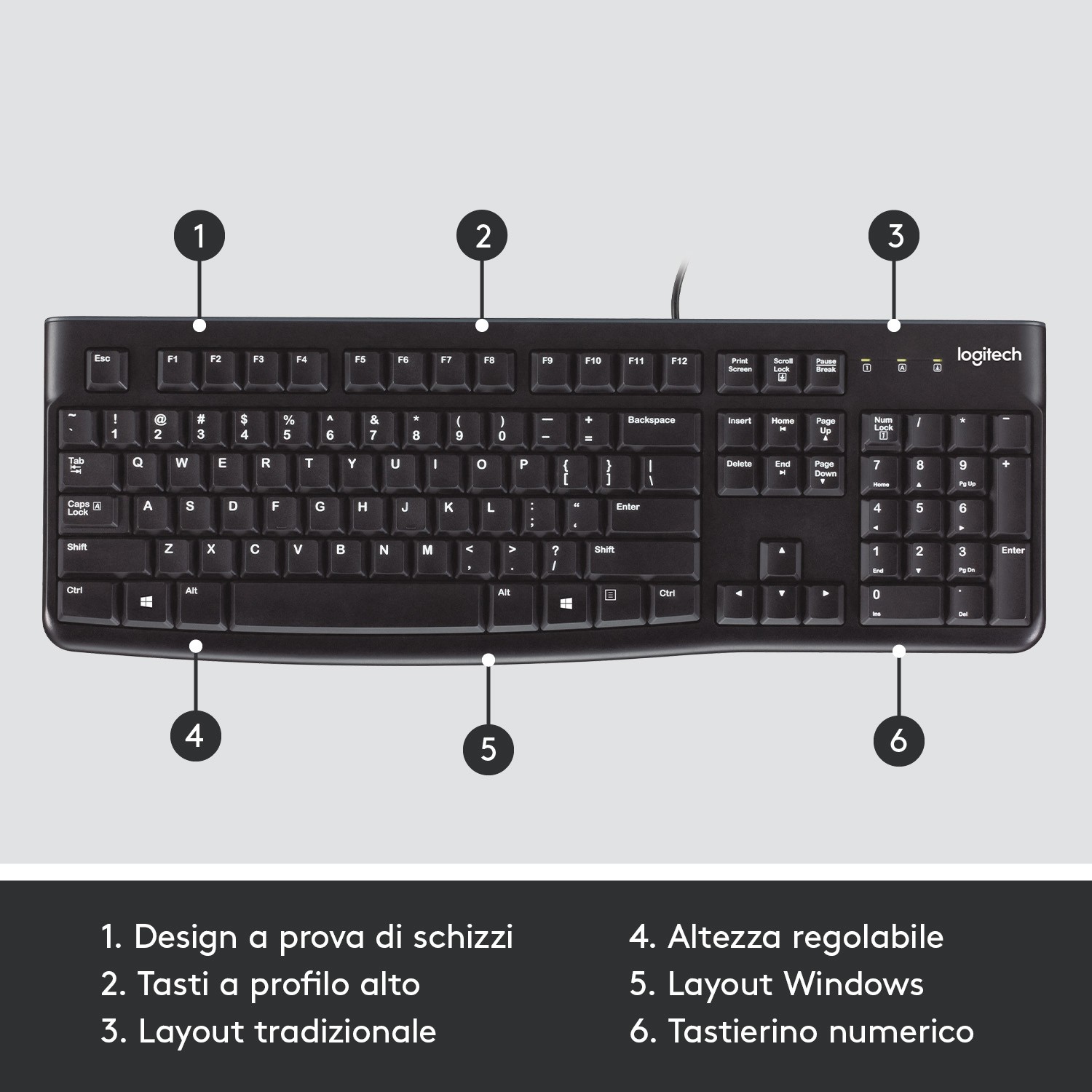 Con una digitazione comoda e silenziosa, un design elegante ma robusto e una connessione USB plug-and-play, la Logitech® Keyboard K120 ti offre un'esperienza di digitazione migliore, pensata per durare nel tempo.