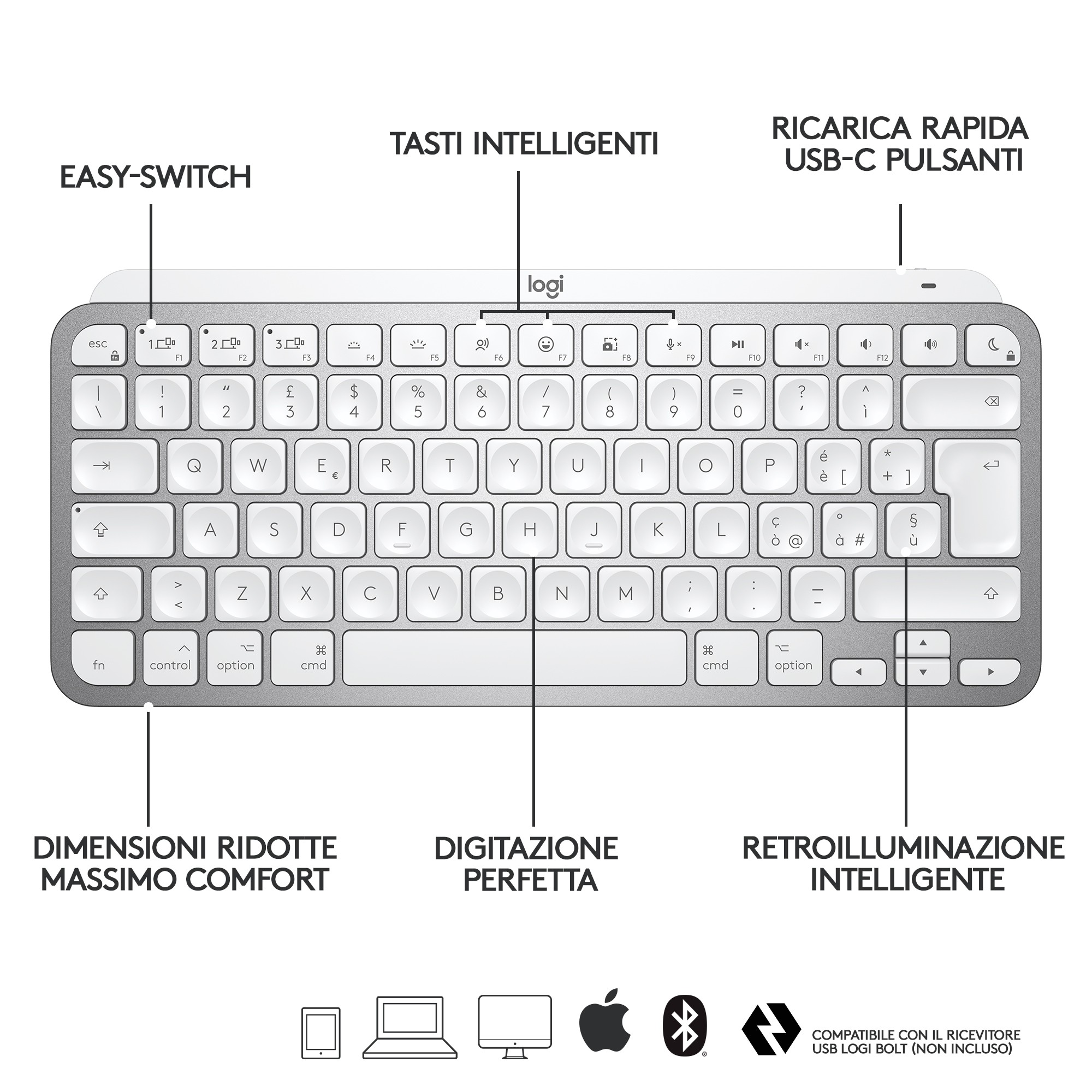 Logitech MX Keys Mini per Mac Tastiera Wireless, Minimal, Compatta, Bluetooth, Tasti Retroilluminati, USB-C, Digitazione Tattile, Compatibile con Apple macOS, iPad OS, in Metallo. Fattore di forma tastiera: Mini. Stile tastiera: Dritto. Interfaccia dispositivo: Bluetooth. Tipologia di retroilluminazione: LED. Utilizzo raccomandato: Ufficio. Colore del prodotto: Grigio