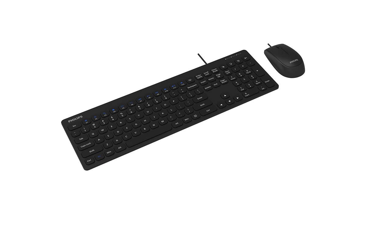 Philips 2000 series SPT6207BL/34. Fattore di forma tastiera: Full-size (100%). Stile tastiera: Dritto. Tecnologia di connessione: Cablato, Interfaccia dispositivo: USB, Struttura tastiera: QWERTY. Lunghezza cavo: 1,6 m. Utilizzo raccomandato: Universale. Colore del prodotto: Nero. Mouse incluso