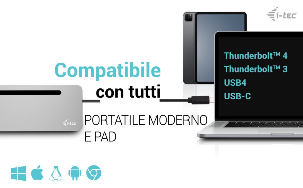 i-tec USB-C Metal Ergonomic 3x 4K Display Docking Station with Power Delivery 100 W + Universal Charger 100 W. Tecnologia di connessione: Cablato, Interfaccia host: USB 3.2 Gen 1 (3.1 Gen 1) Type-C, Fornitura di alimentazione USB fino a: 100 W. Velocità trasferimento Ethernet LAN: 10,100,1000 Mbit/s. Colore del prodotto: Argento, Tipi schede di memoria: MicroSD (TransFlash), SD, Velocità di trasferimento dati: 5 Gbit/s. Tipologia alimentazione: AC, Tensione di ingresso AC: 100-240 V, Frequenza di ingresso AC: 50-60 Hz. Altri sistemi operativi supportati: Android, ChromeOS