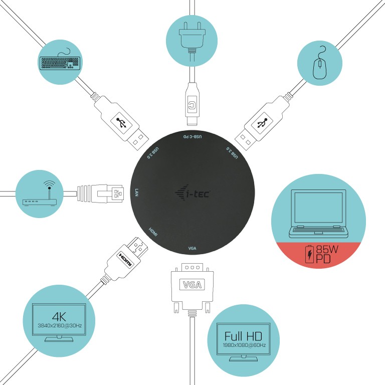 i-tec C31POCKET4KDOCKPD, Cablato, USB 3.2 Gen 1 (3.1 Gen 1) Type-C, 85 W, Nero, USB, Android