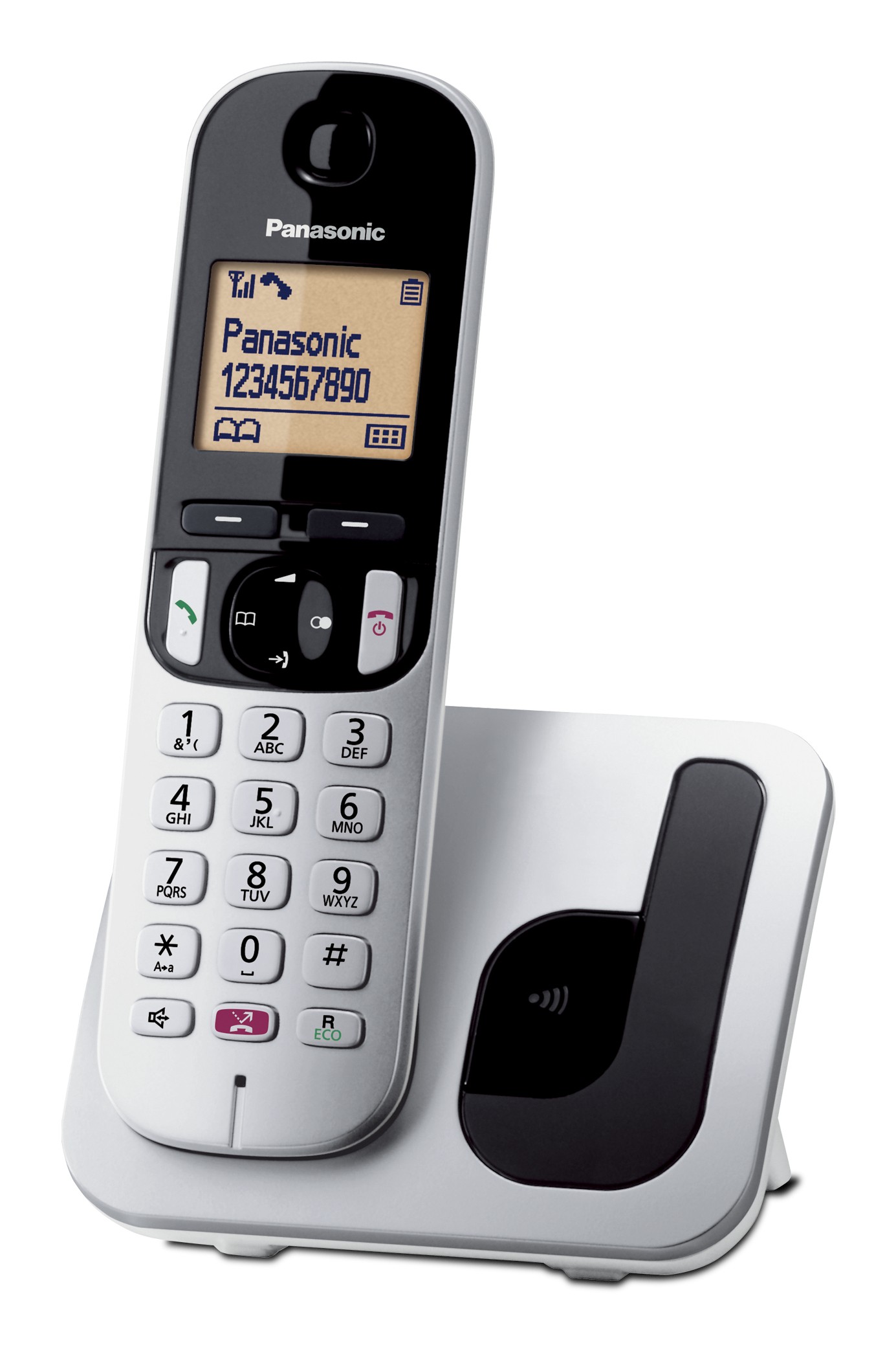 Panasonic Telefono cordless digitale KX-TGC250. Tipo: Telefono DECT, Tipo di apparecchio: Cornetta wireless. Telefono con vivavoce, Capacità rubrica: 50 voci. Identificatore di chiamata. Dimensioni diagonale schermo: 4,06 cm (1.6"). Colore del prodotto: Nero, Argento. Numero di cornette incluse: 1