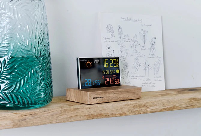 Thomson CT610. Colore del prodotto: Legno, Funzioni di misurazione: Termometro da interno, Barometro da esterno, Igrometro per esterno, Termometro da esterno, Range di misurazione del barometro: 85 - 110 kPa. Tipo di display: LCD. Alimentazione: CA/Batteria, Tipo batteria: AAA. Larghezza: 165 mm, Profondità: 95 mm, Altezza: 45 mm. Tecnologia di connessione: Con cavo e senza cavo