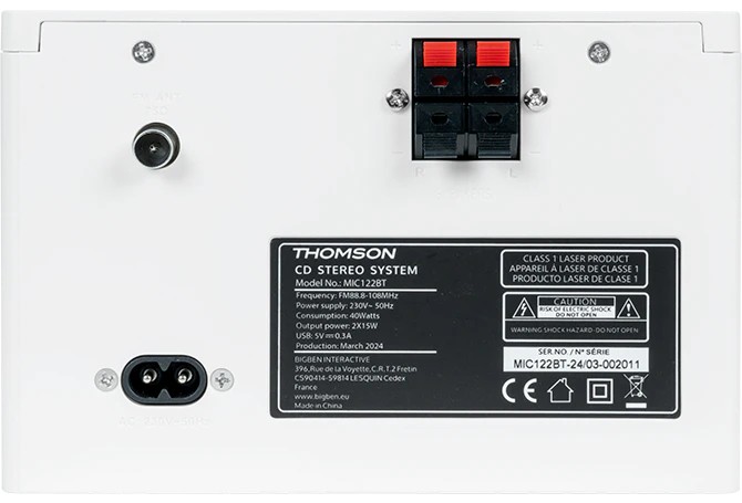 Thomson MIC122BT. Tipo: Microsistema audio per la casa, Colore del prodotto: Nero, Argento, Meccanismo caricamento: Frontale. Potenza in uscita (RMS): 10 W, Impedenza: 6 Ω, Rapporto segnale/rumore (SNR): 75 dB. Bande del sintonizzatore: FM, Sintonizzatore migliorato: Scansione automatica, Tipo sintonizzatore: Digitale. Portata Bluetooth: 10 m. Connessione cuffia: 3,5 mm