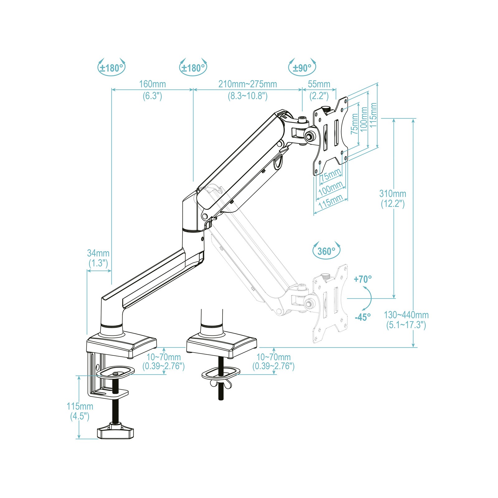 TooQ DB1334TNR-W. Montaggio: Morsetto/occhiello, Peso massimo (capacità): 10 kg, Capienza minima dimensioni dello schermo: 33 cm (13"), Capienza massima dimensioni dello schermo: 86,4 cm (34"), Compatibilità interfaccia di montaggio (min): 75 x 75 mm, Compatibilità interfaccia di montaggio (max): 100 x 100 mm. Regolazione altezza, Angolo di rotazione: -90 - 90°, Inclinazione: -45 - 70°. Colore del prodotto: Bianco