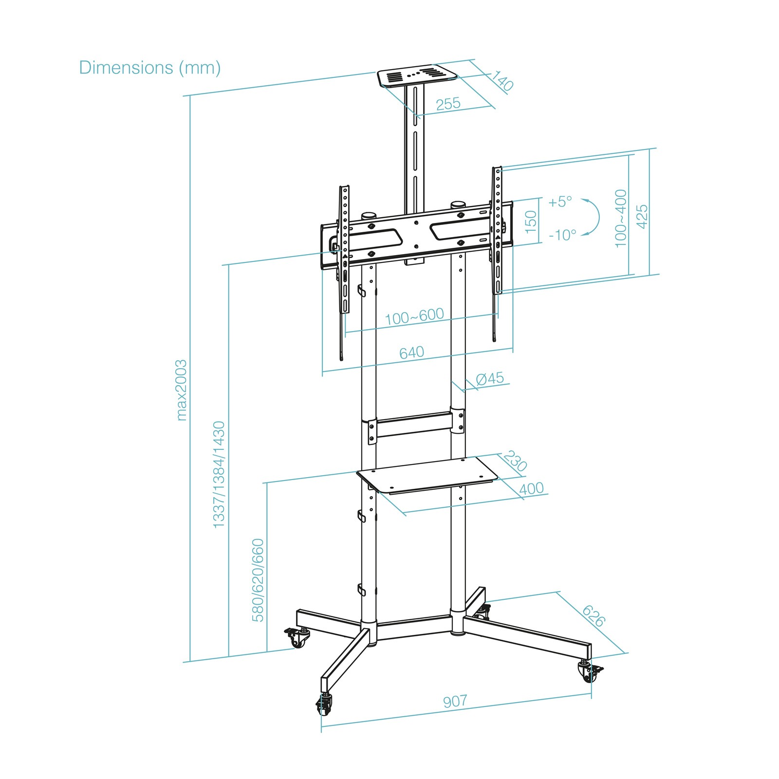TooQ FS1151M-B. Peso massimo (capacità): 70 kg, Capienza minima dimensioni dello schermo: 94 cm (37"), Capienza massima dimensioni dello schermo: 177,8 cm (70"), Compatibilità interfaccia di montaggio (min): 100 x 100 mm, Compatibilità interfaccia di montaggio (max): 600 x 400 mm. Range di regolazione altezza: 1337 - 1430 mm, Inclinazione: -10 - 5°. Colore del prodotto: Nero