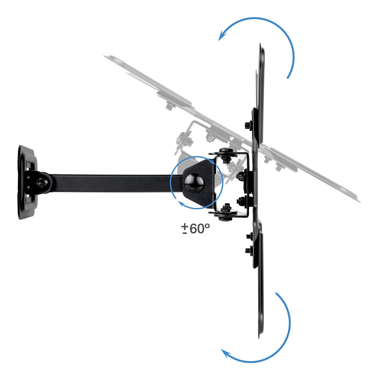 TooQ LP1343TN-B. Peso massimo (capacità): 20 kg, Capienza minima dimensioni dello schermo: 33 cm (13"), Capienza massima dimensioni dello schermo: 109,2 cm (43"), Compatibilità interfaccia di montaggio (min): 75 x 75 mm, Compatibilità interfaccia di montaggio (max): 200 x 200 mm. Inclinazione: -15 - 5°, Angolo di rotazione: -60 - 60°, Distanza dalla parete (min): 6,6 cm, Distanza dal muro (massima): 19,8 cm. Colore del prodotto: Nero