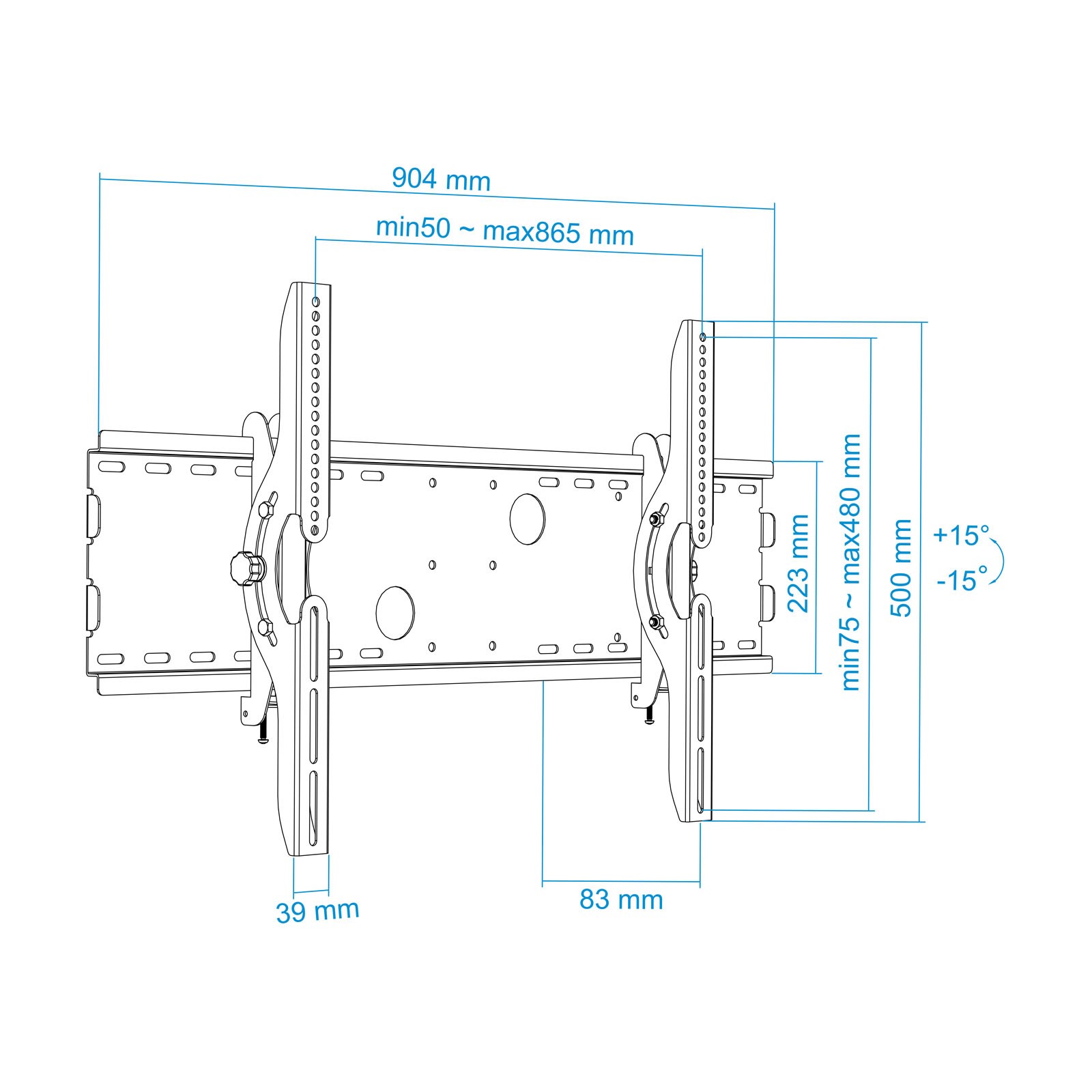 TooQ LP4970T-B. Peso massimo (capacità): 75 kg, Capienza minima dimensioni dello schermo: 94 cm (37"), Capienza massima dimensioni dello schermo: 177,8 cm (70"), Compatibilità interfaccia di montaggio (min): 800 x 400 mm, Compatibilità interfaccia di montaggio (max): 800 x 400 mm. Inclinazione: -15 - 15°, Distanza dalla parete (min): 8,3 cm. Colore del prodotto: Nero