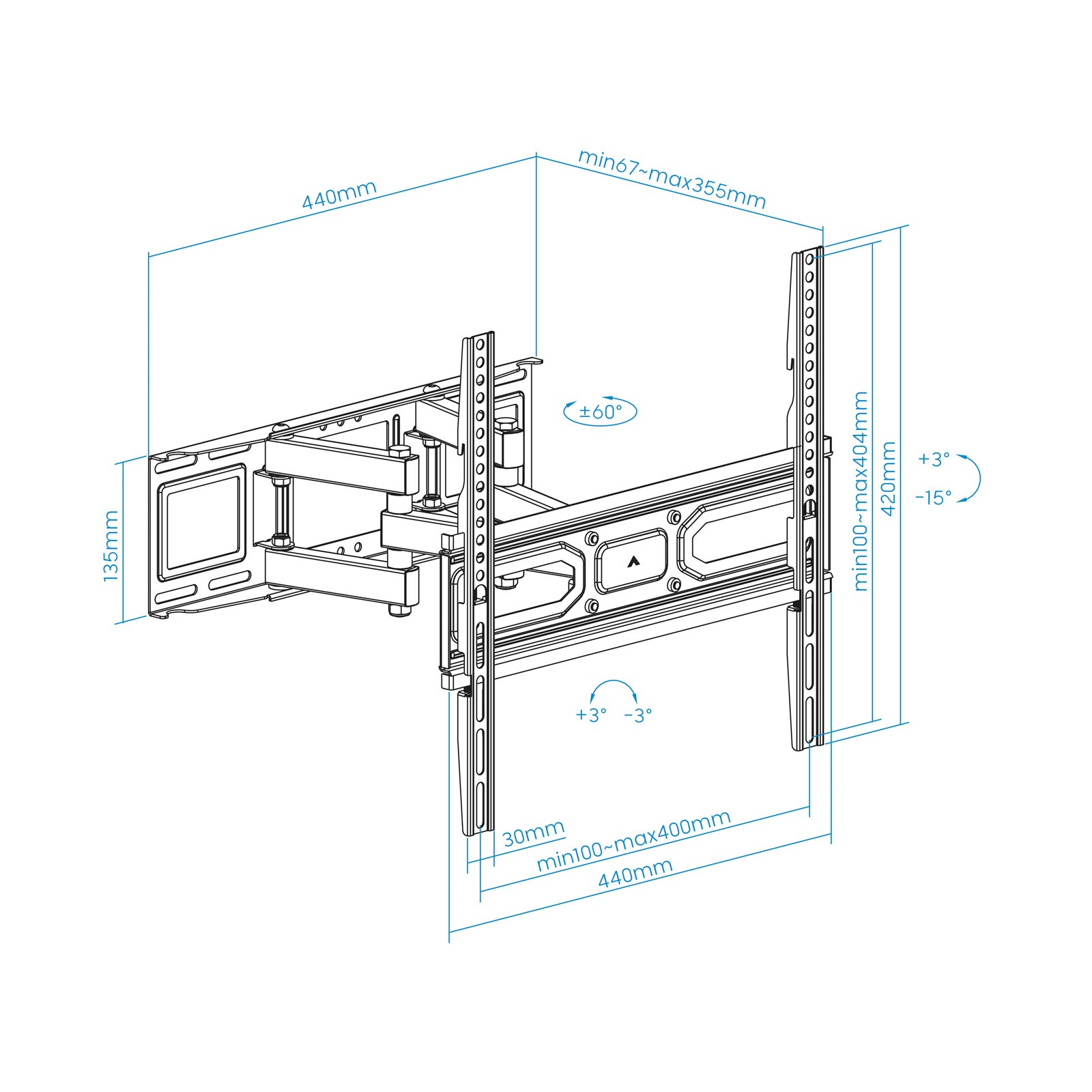 TooQ LP7846TN-B. Peso massimo (capacità): 40 kg, Capienza minima dimensioni dello schermo: 81,3 cm (32"), Capienza massima dimensioni dello schermo: 177,8 cm (70"), Compatibilità interfaccia di montaggio (min): 100 x 100 mm, Compatibilità interfaccia di montaggio (max): 400 x 400 mm. Inclinazione: -15 - 3°, Angolo di rotazione: -60 - 60°, Distanza dalla parete (min): 6,7 cm, Distanza dal muro (massima): 35,5 cm. Colore del prodotto: Nero