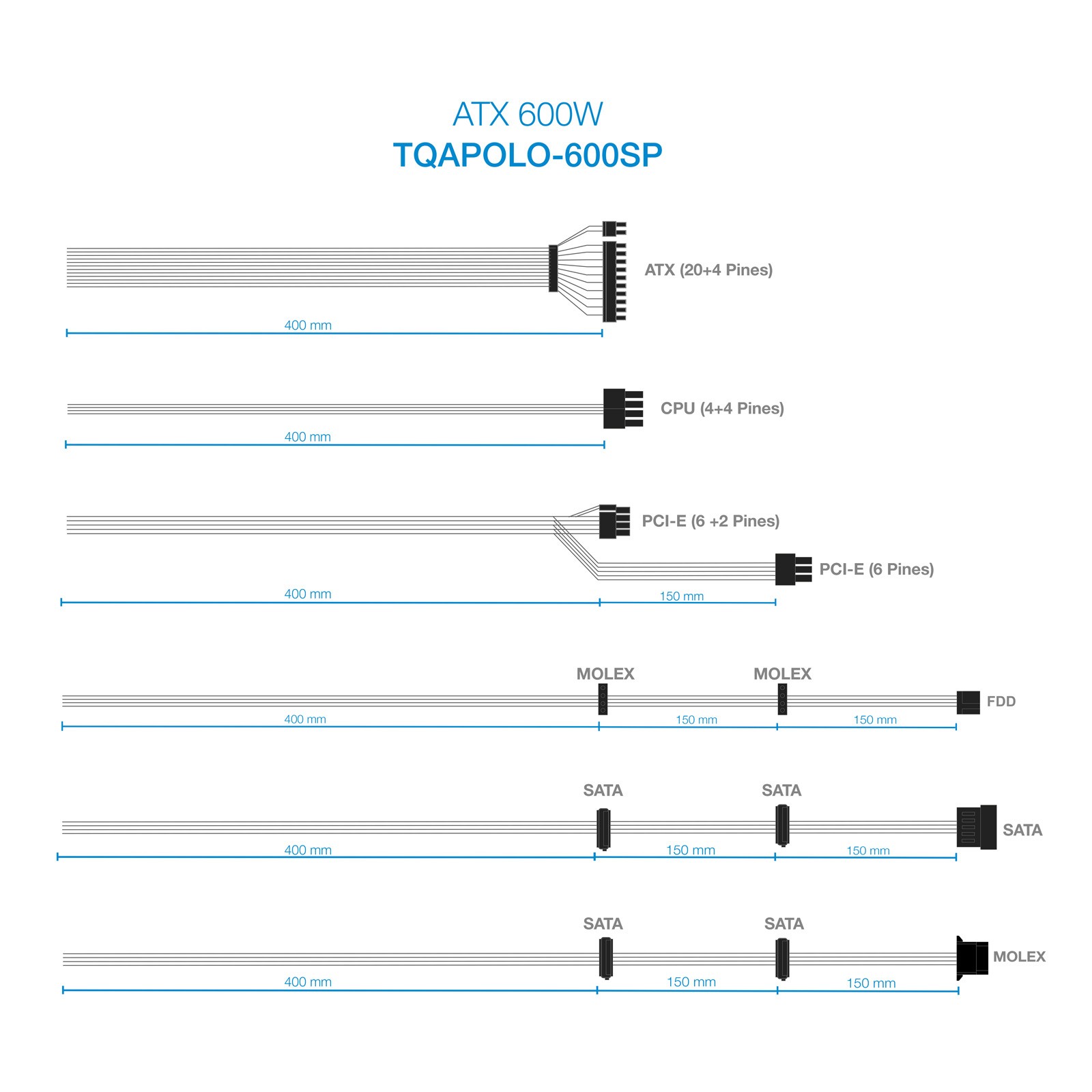 TooQ TQAPOLO-600SP. Potenza totale: 600 W, Tensione di ingresso AC: 220 V, Frequenza di ingresso AC: 50 - 60 Hz. Connettore scheda madre: 20+4 pin ATX, Lunghezza del cavo di alimentazione della scheda madre: 40 cm, Lunghezza del cavo di alimentazione SATA: 700 mm. Utilizzo: PC, Fattore di forma dell'unità di alimentazione (PSU): ATX, Fattore di forma scheda madre supportato: ATX. Colore del prodotto: Nero, Tipo di raffreddamento: Attivo, Diametro del ventilatore: 14 cm. Cavi inclusi: AC