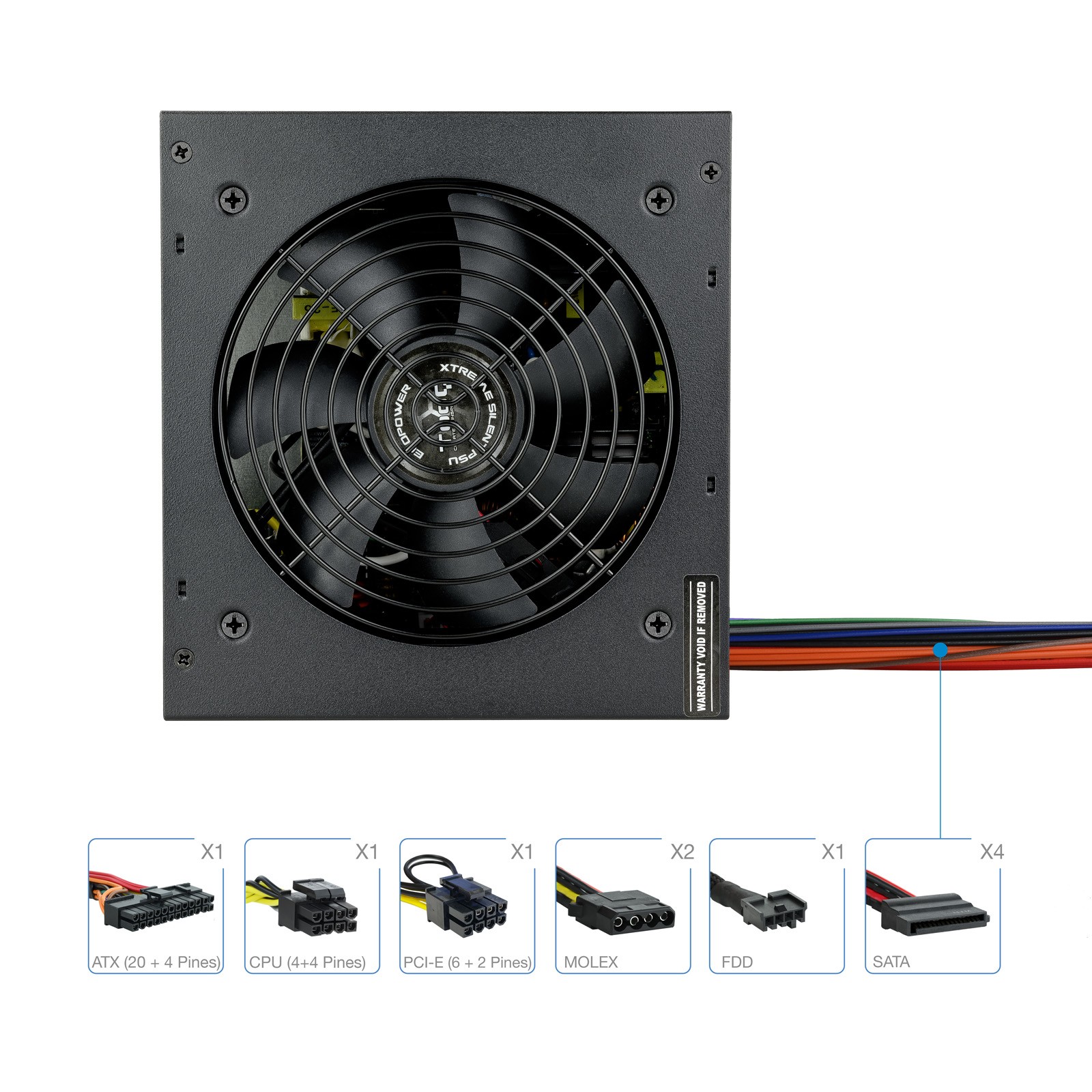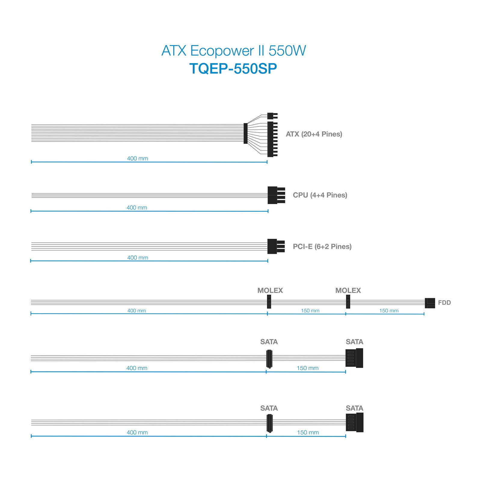 TooQ TQEP-550SP. Potenza totale: 550 W, Tensione di ingresso AC: 220 V, Frequenza di ingresso AC: 50 - 60 Hz. Connettore scheda madre: 20+4 pin ATX, Tipo di cablaggio: Non modulare. Fattore di forma dell'unità di alimentazione (PSU): ATX, Emissione acustica: 15 dB, Tempo medio tra guasti (MTBF): 10000 h. Colore del prodotto: Nero, Tipo di raffreddamento: Attivo, Diametro del ventilatore: 12 cm. Cavi inclusi: AC
