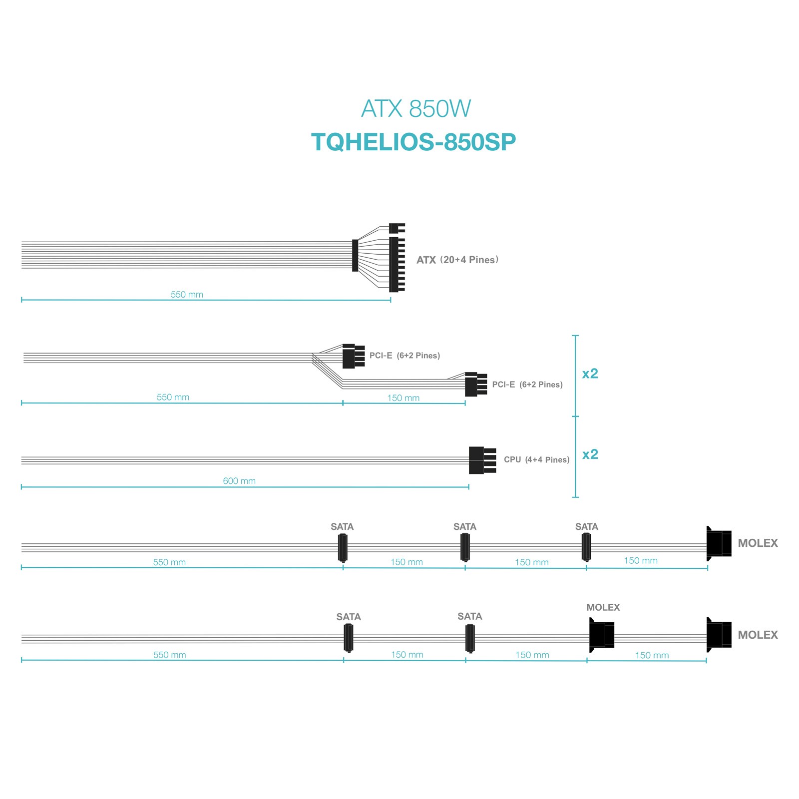 TooQ TQHELIOS-850SP. Potenza totale: 850 W, Tensione di ingresso AC: 200 - 240 V, Frequenza di ingresso AC: 50 Hz. Connettore scheda madre: 24-pin ATX, Lunghezza del cavo di alimentazione della scheda madre: 55 cm, Lunghezza del cavo di alimentazione SATA: 550,700,850,1000 mm. Utilizzo: PC, Fattore di forma dell'unità di alimentazione (PSU): ATX, Certificazione 80 PLUS: 80 PLUS Bronze. Colore del prodotto: Nero, Tipo di raffreddamento: Attivo, Diametro del ventilatore: 12 cm. Certificati di conformità: CE, RoHS