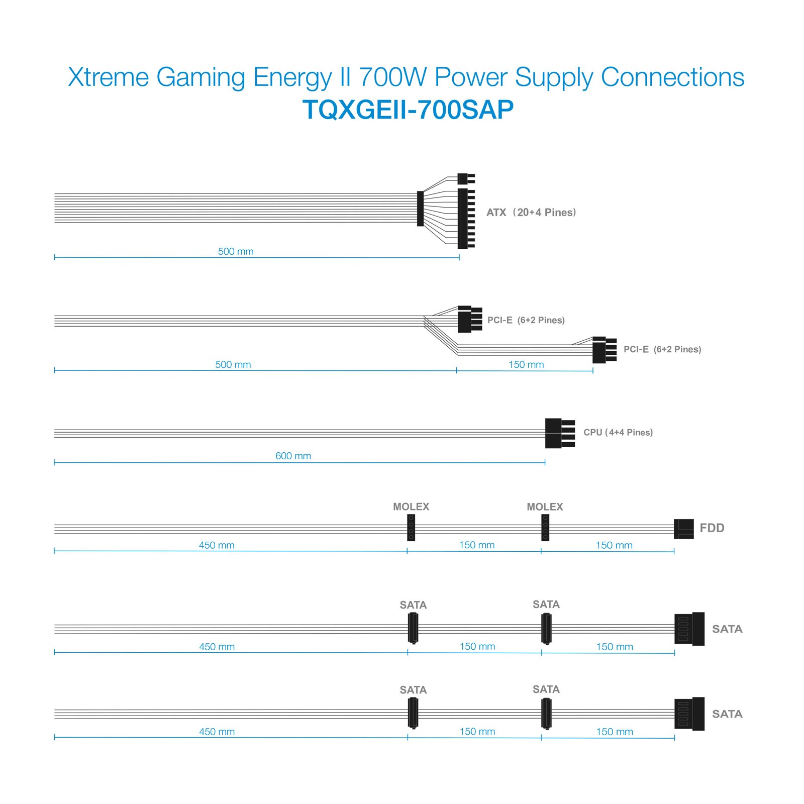 TooQ TQXGEII-700SAP. Potenza totale: 700 W, Tensione di ingresso AC: 110 - 230 V, Frequenza di ingresso AC: 50 - 60 Hz. Connettore scheda madre: 20+4 pin ATX, Lunghezza del cavo di alimentazione della scheda madre: 50 cm, Lunghezza del cavo di alimentazione SATA: 450,600,750 mm. Utilizzo: PC, Fattore di forma dell'unità di alimentazione (PSU): ATX, Certificazione 80 PLUS: 80 PLUS Bronze. Colore del prodotto: Nero, Tipo di raffreddamento: Attivo, Diametro del ventilatore: 14 cm. Cavi inclusi: AC